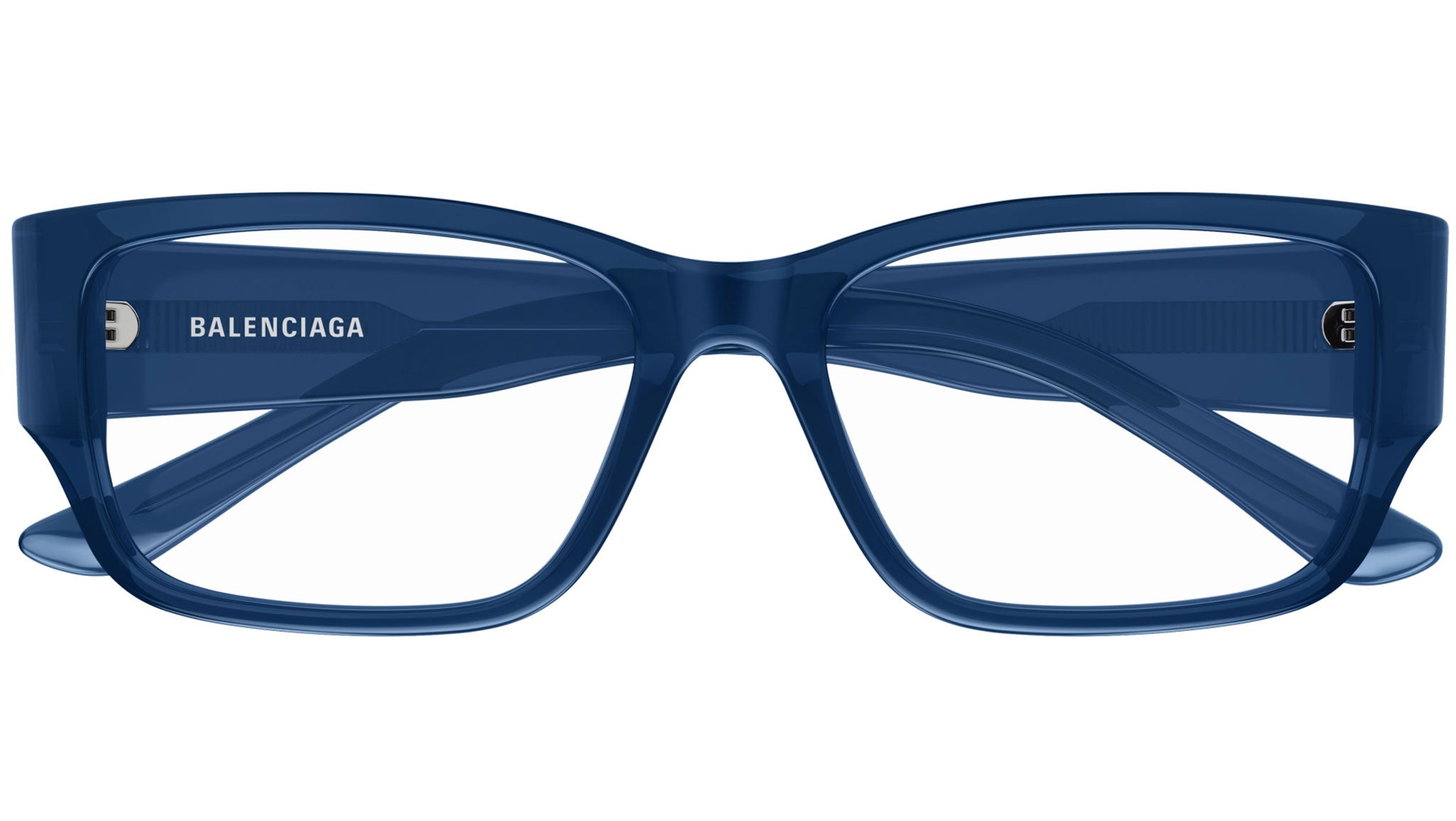 Occhiali da vista Balenciaga modello BB0373OK linea Everyday codice colore 003 blu scuro trasparente lucido in acetato riciclato forma rettangolare con aste color blu e lenti demo trasparenti. Rivenditore autorizzato Balenciaga online. Gli occhiali vengono consegnati con custodia e accessori originali e sono coperti dalla garanzia ufficiale di 12 mesi del produttore.