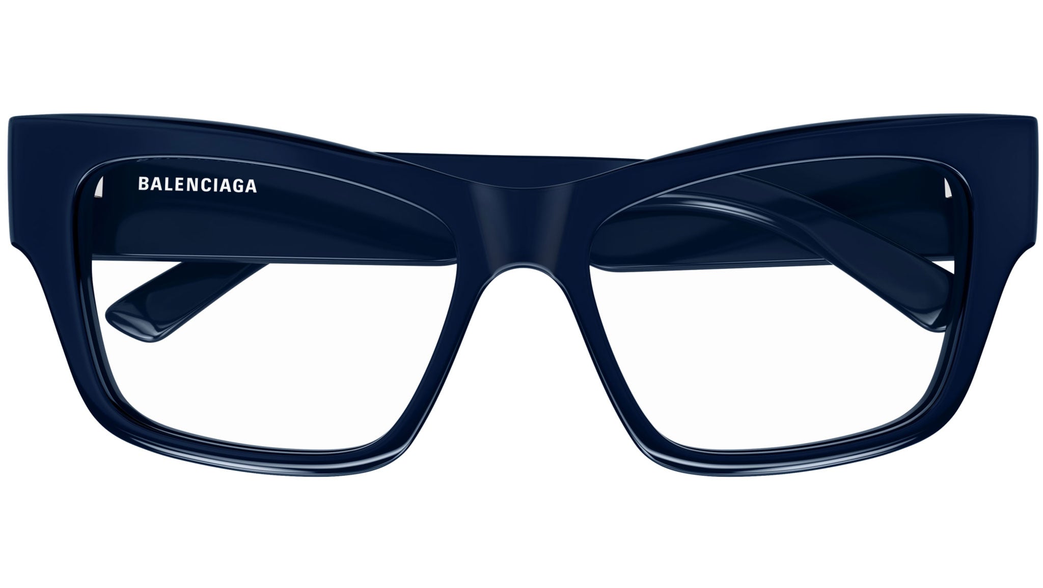 Occhiali da vista Balenciaga modello BB0378O linea Everyday codice colore 003 blu lucido tinta unita in acetato riciclato forma a gatto con aste color blu e lenti demo trasparenti. Rivenditore autorizzato Balenciaga online. Gli occhiali vengono consegnati con custodia e accessori originali e sono coperti dalla garanzia ufficiale di 12 mesi del produttore.