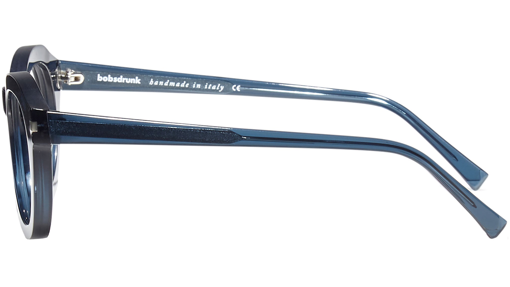 Montatura da vista Bobsdrunk Lee codice colore 132 in tonalità blu inchiostro trasparente. Prodotti senza tempo e forme audaci convivono in questa originale collezione Eyewear. Le linee sono disegnate con maestria, per creare un effetto di audace leggerezza. Ogni paio di occhiali Bobsdrunk è caratterizzato da un dettaglio emblematico, mostrato sulla parte anteriore e sulla punta delle aste, che evidenzia il valore del marchio. Rappresenta in un iconico simbolo l'unione della lettera iniziale e finale di Bobsdrunk. La scelta accurata dei materiali, la selezione dell'artigianalità e una costante ricerca cromatica sono le prerogative di ogni creazione di Bobsdrunk.