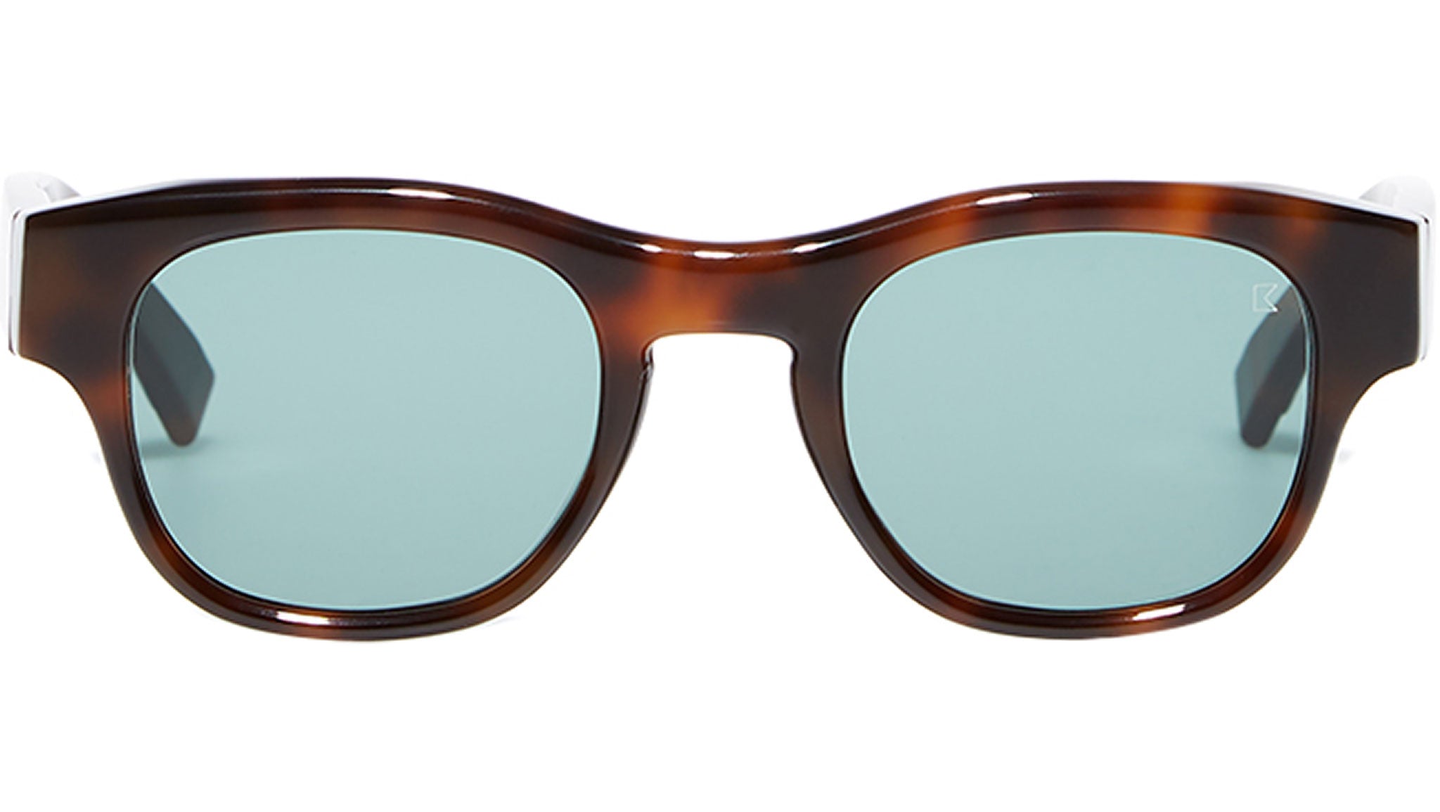 Acetate frame in tortoise with green solid lenses.