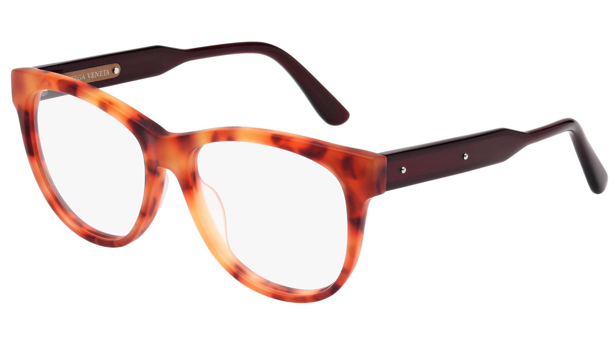 Occhiali da vista Bottega Veneta modello 0004O 002 featuring semimatte red havana front frame and violet temple.