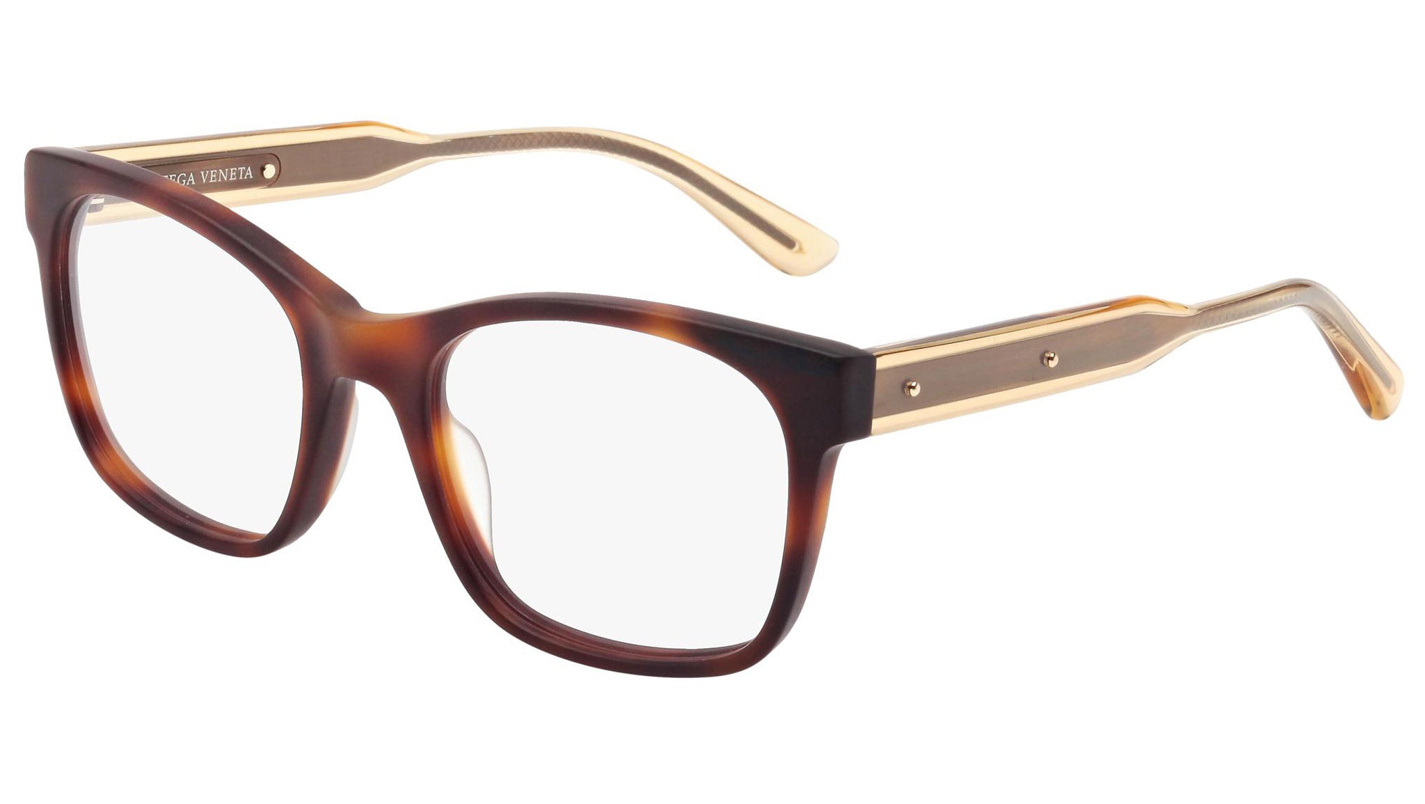 Occhiali da vista Bottega Veneta modello 0005O 003 featuring semimatte medium havana front frame and yellow temple.