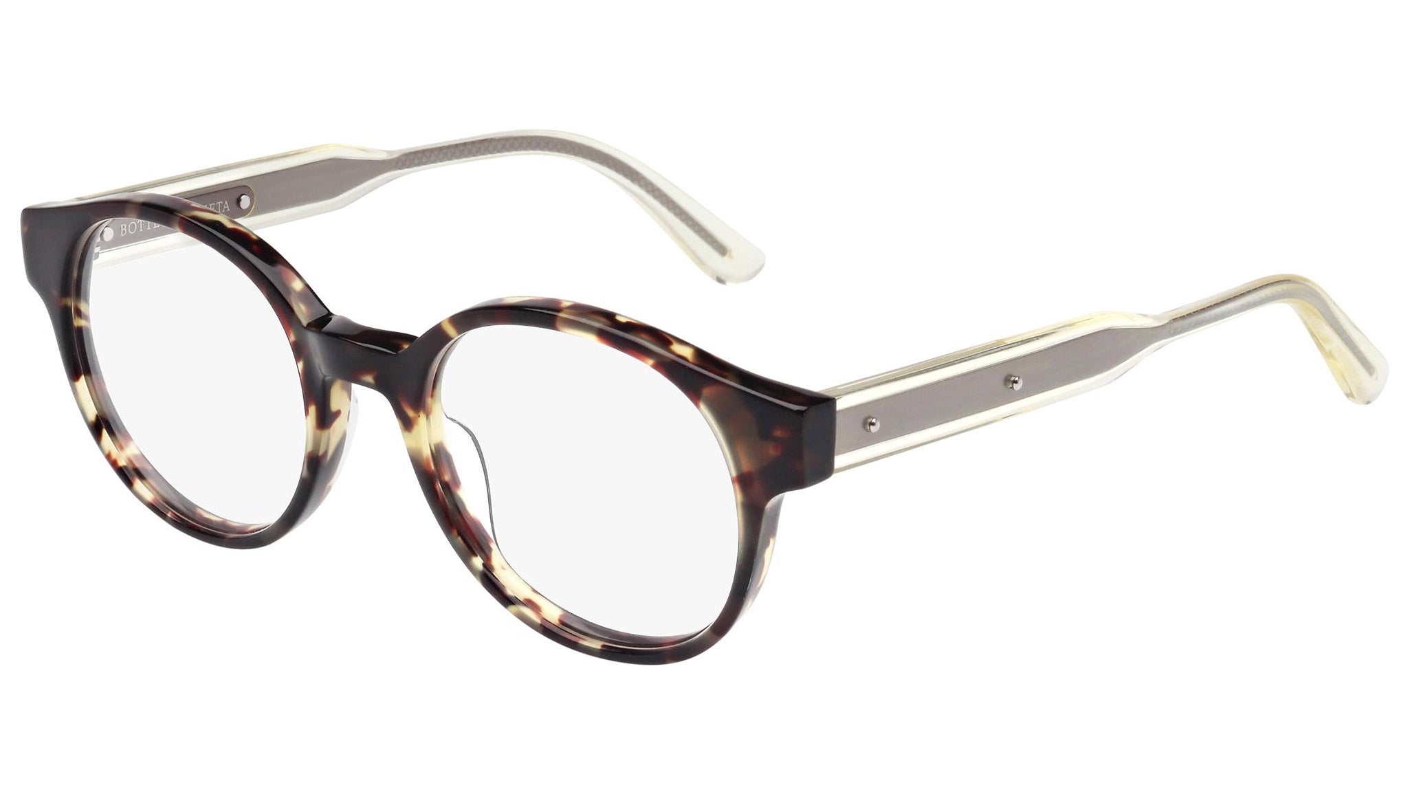 Occhiali da vista Bottega Veneta modello 0006O 004 featuring shiny havana front frame and yellow temple.
