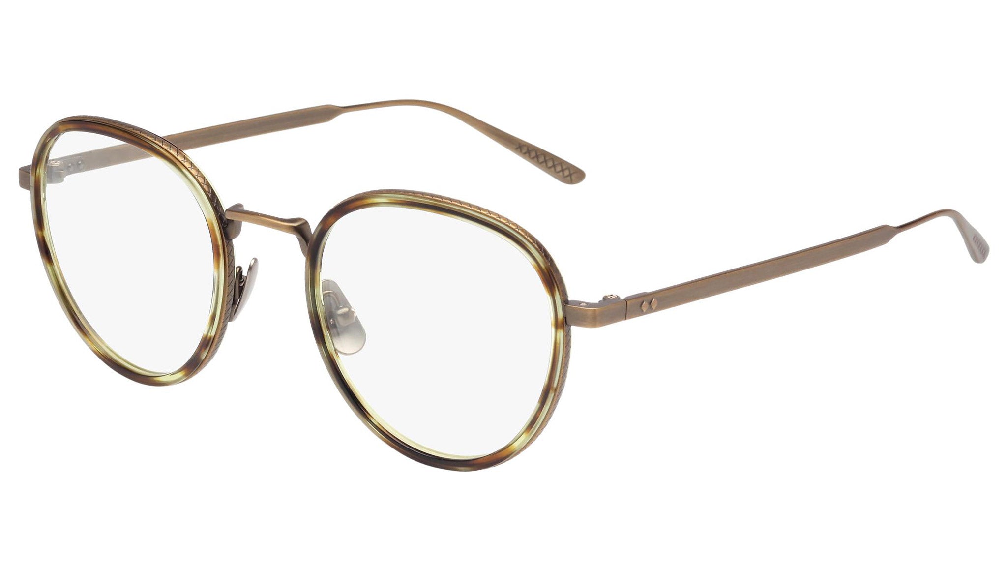 Occhiali da vista Bottega Veneta modello 0018O 001 featuring semimatte antique brass and havana front frame and bronze temple.