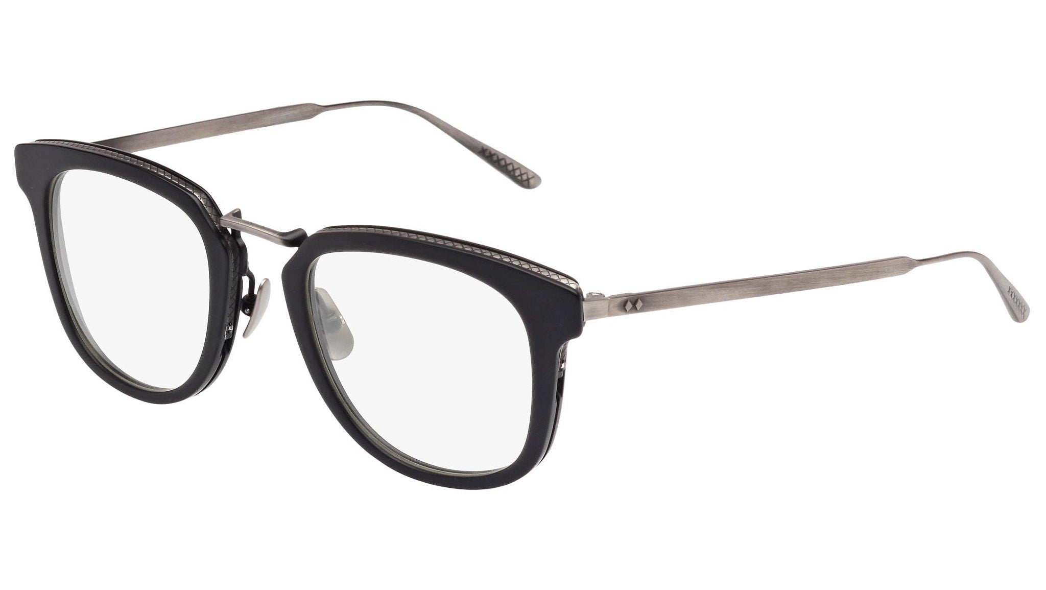 Occhiali da vista Bottega Veneta modello 0019O 003 featuring semimatte antique silver and black front frame and silver temple.