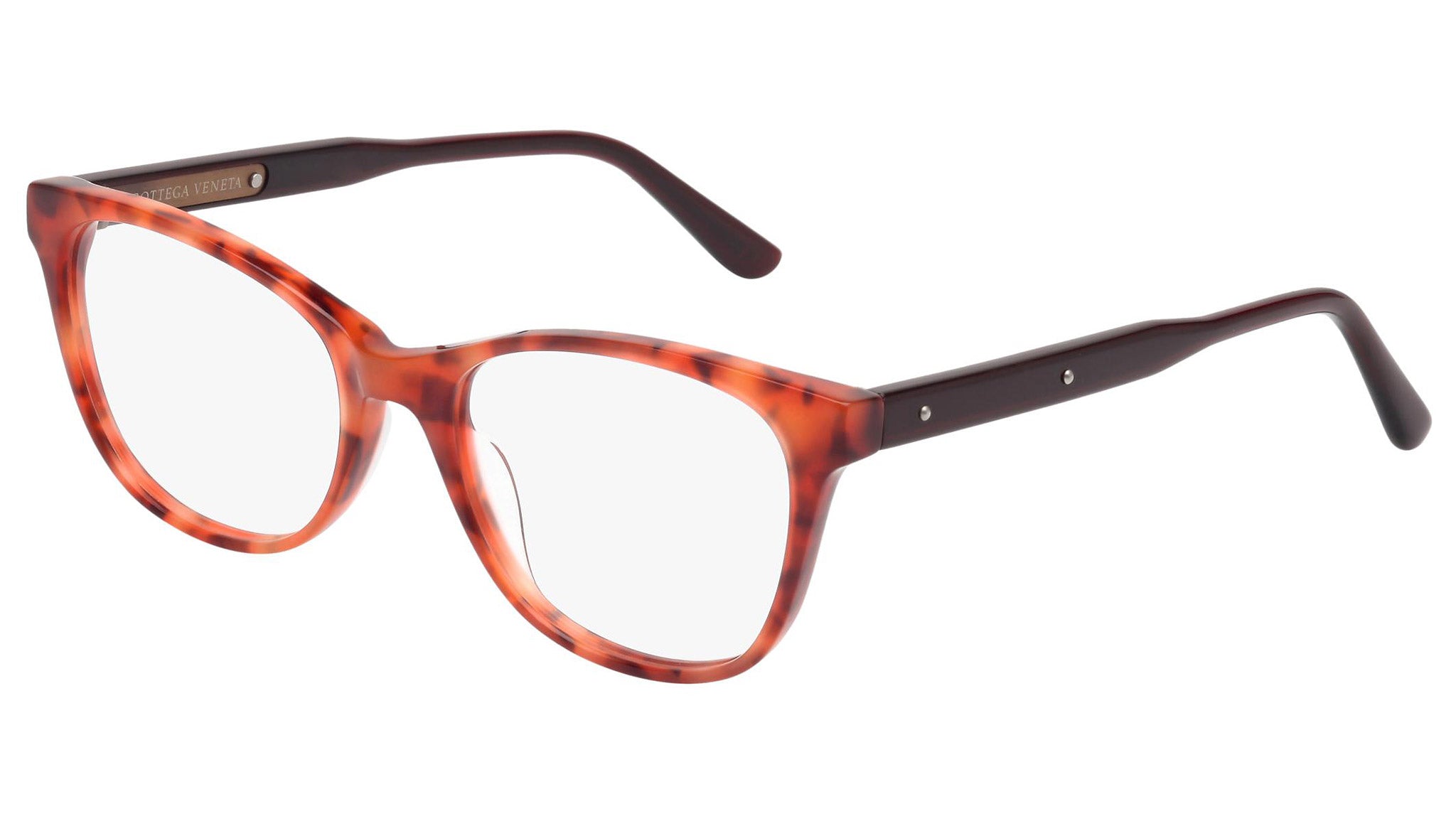 Occhiali da vista Bottega Veneta modello 0024O 004 featuring shiny red havana front frame and red temple.
