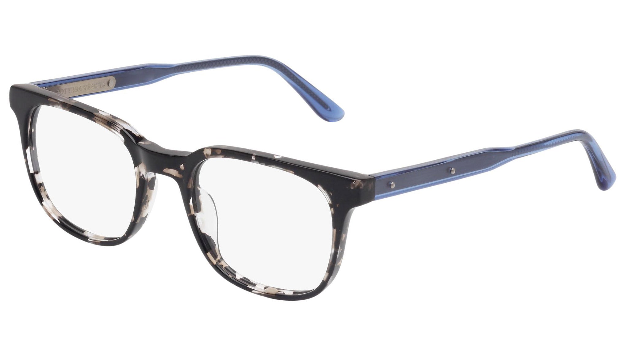 Occhiali da vista Bottega Veneta modello 0026O 002 featuring shiny grey havana front frame and blue temple.