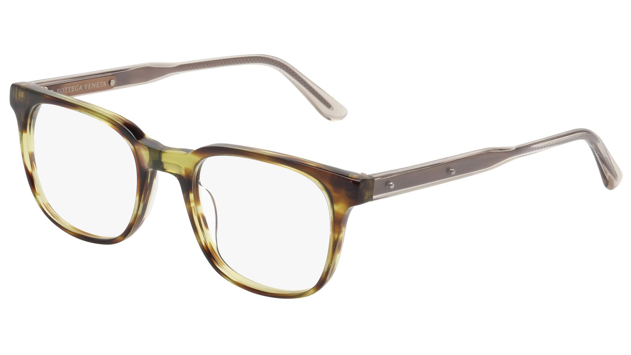 Occhiali da vista Bottega Veneta modello 0026O 003 featuring shiny green striped havana front frame and brown temple.