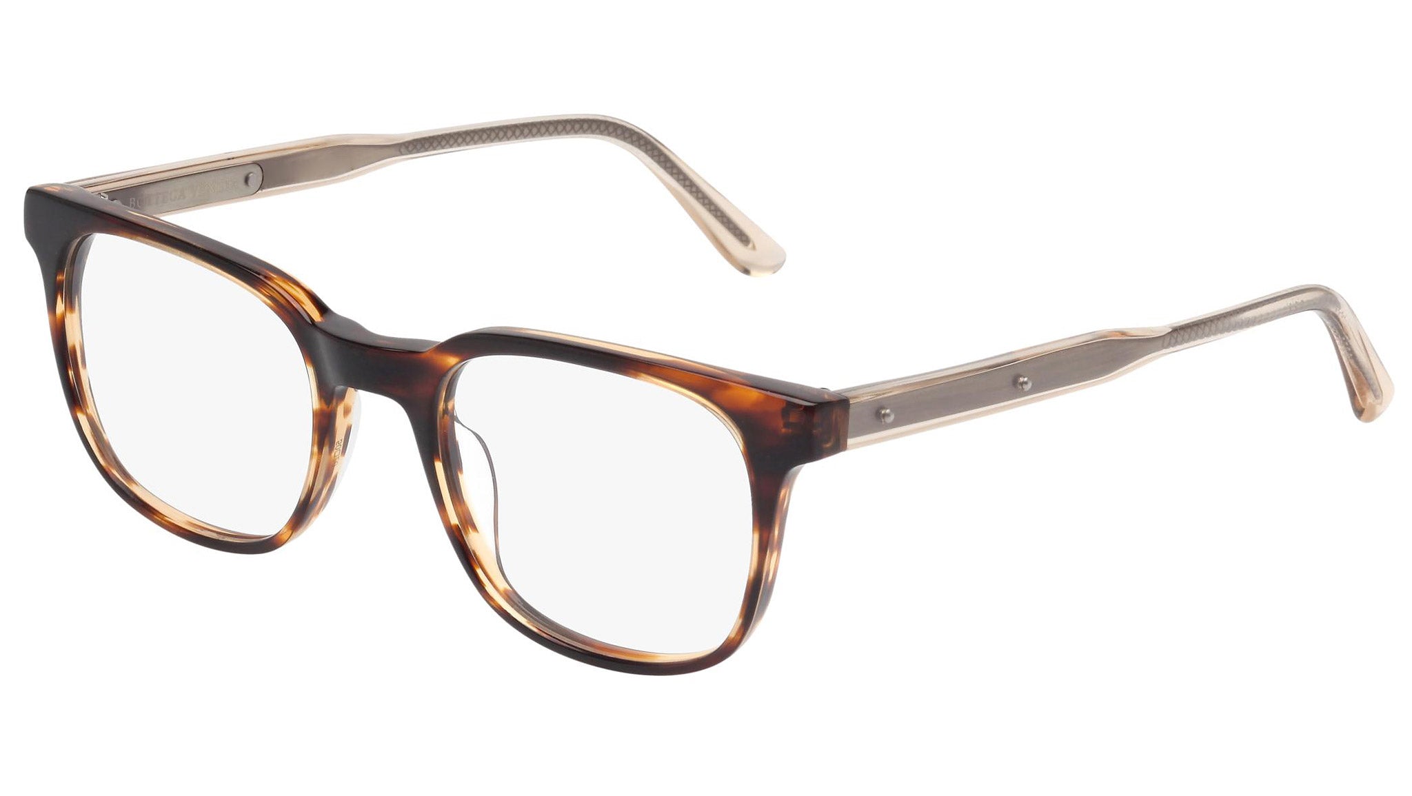 Occhiali da vista Bottega Veneta modello 0026O 004 featuring shiny brown striped havana front frame and yellow temple.