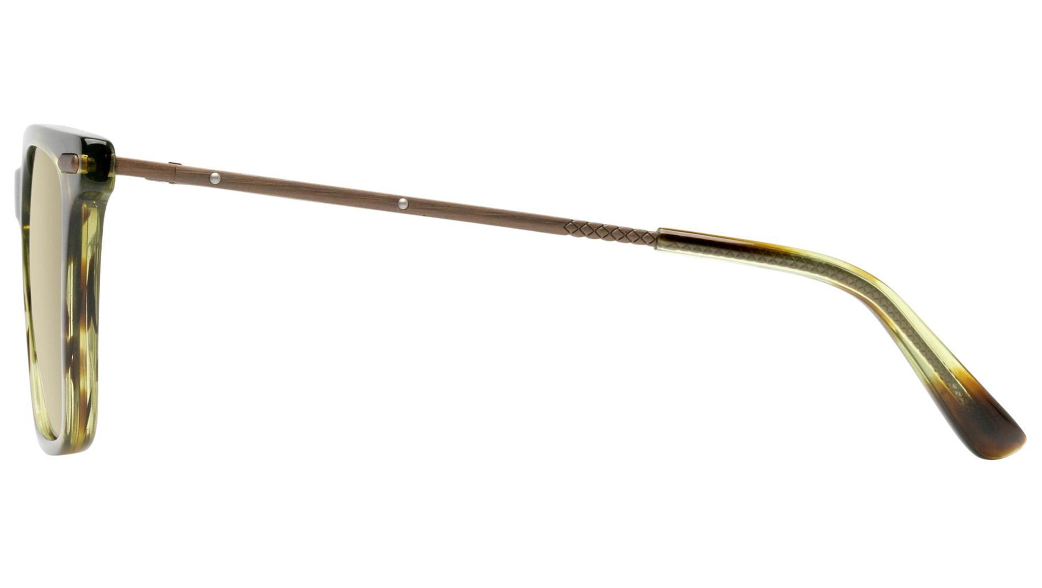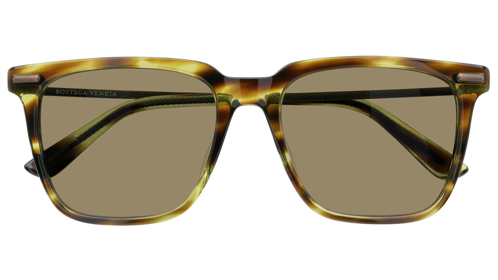 Bottega Veneta sunglasses collection model 0027S 003 featuring shiny green striped havana front frame and solid green lens. Inspired by Italian culture with a global outlook, the House is defined by a distinctly refined attitude. Bottega Veneta uses noble materials to create considered pieces that become part of their owner’s lives.