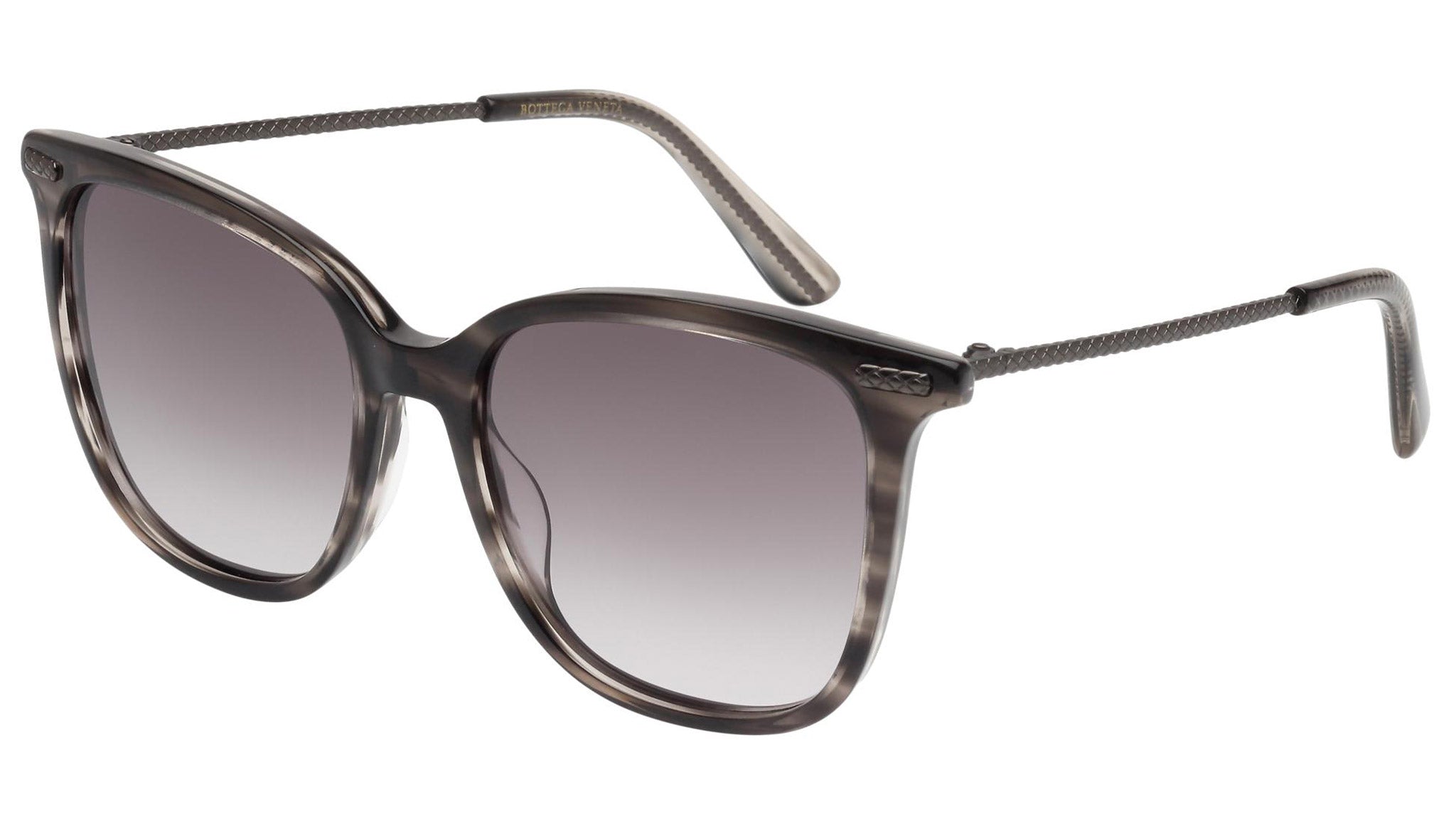 Bottega Veneta sunglasses collection model 0028S 003 featuring shiny grey striped havana front frame and gradient grey lens. Inspired by Italian culture with a global outlook, the House is defined by a distinctly refined attitude. Bottega Veneta uses noble materials to create considered pieces that become part of their owner’s lives.