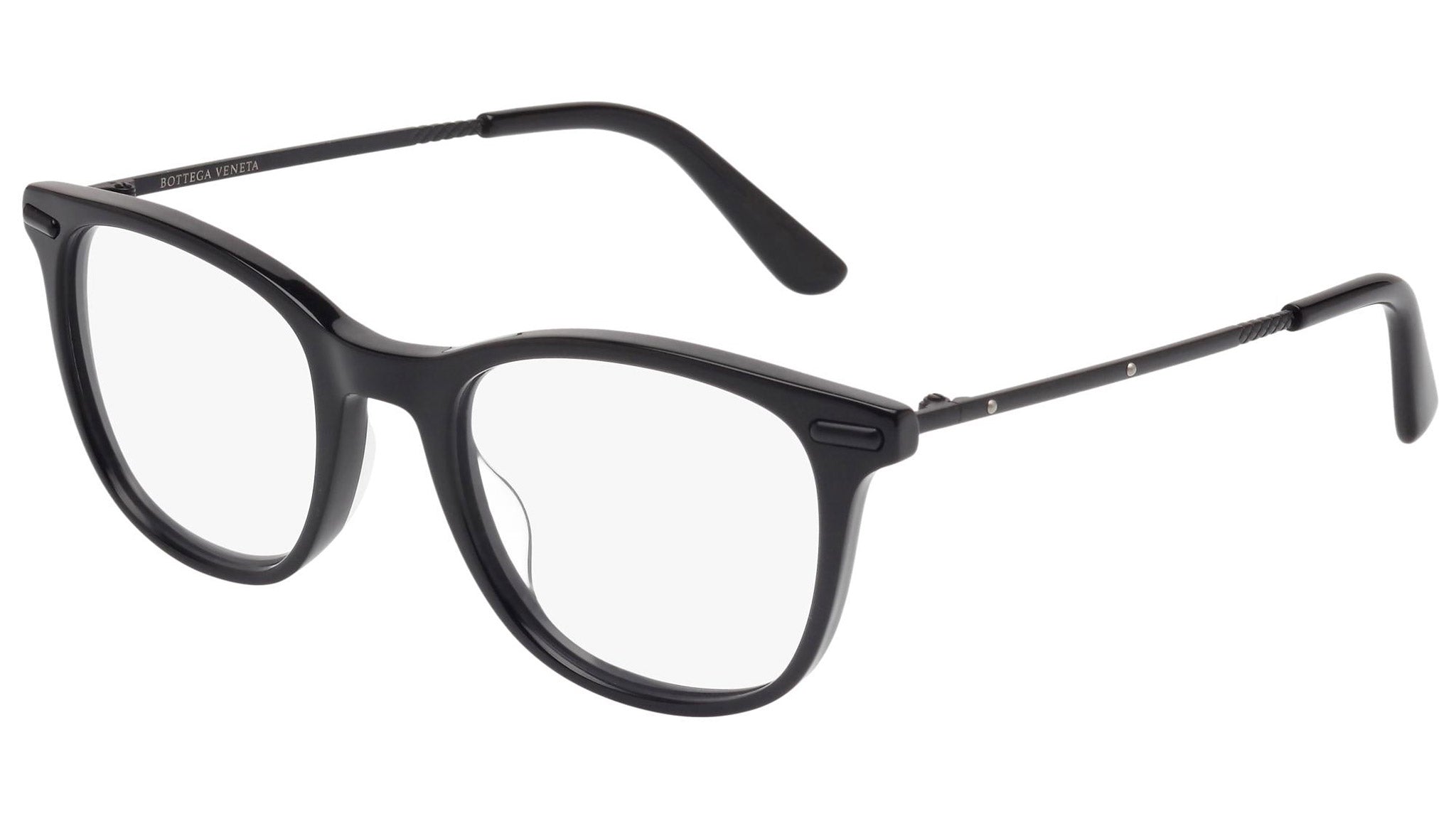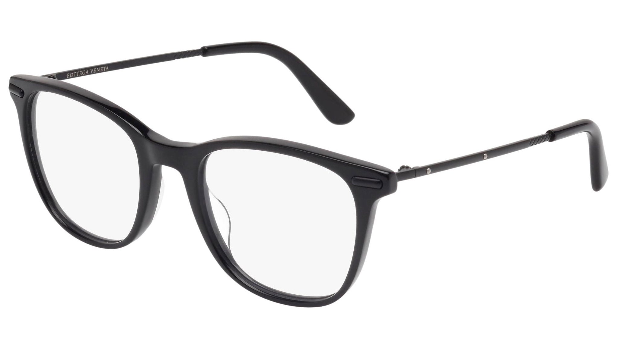 Occhiali da vista Bottega Veneta modello 0033O 001 featuring shiny black front frame and black temple.