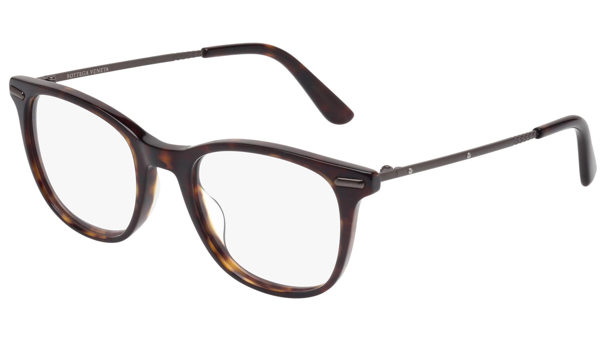 Occhiali da vista Bottega Veneta modello 0033O 004 featuring shiny dark havana front frame and ruthenium temple.