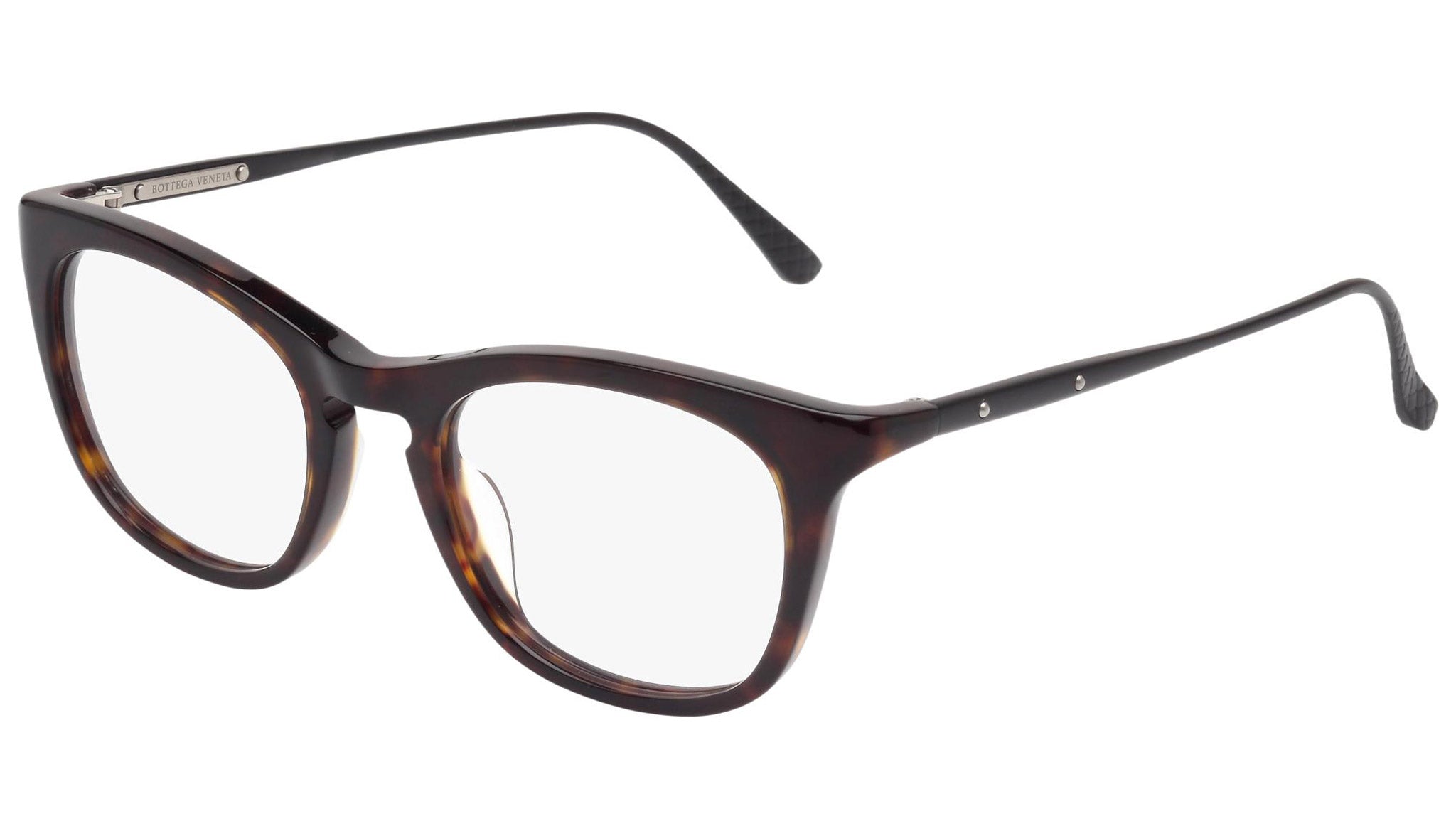 Occhiali da vista Bottega Veneta modello 0039O 003 featuring shiny dark havana front frame and black temple.