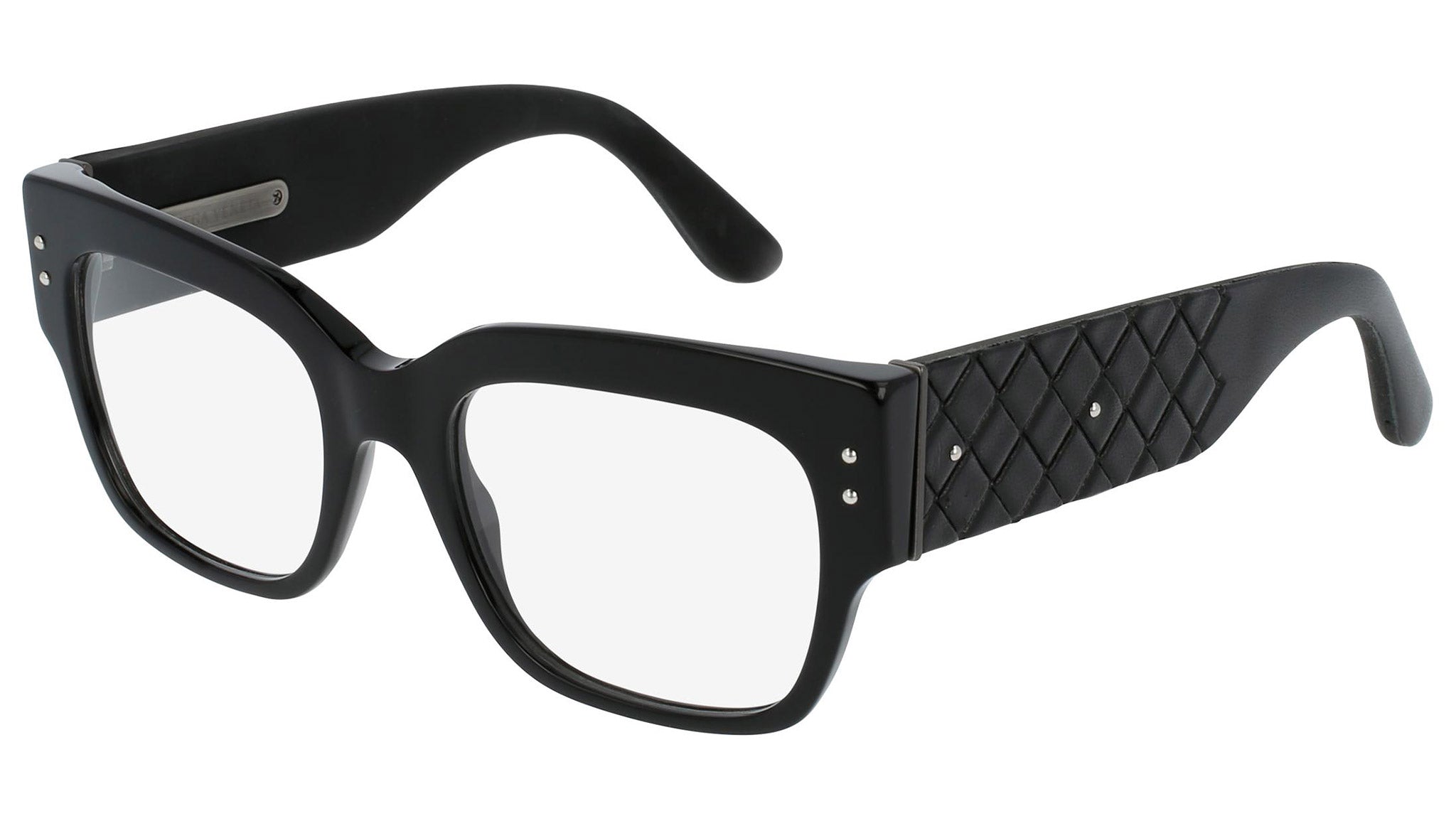 Occhiali da vista Bottega Veneta modello 0047O 001 featuring shiny black front frame and black temple.