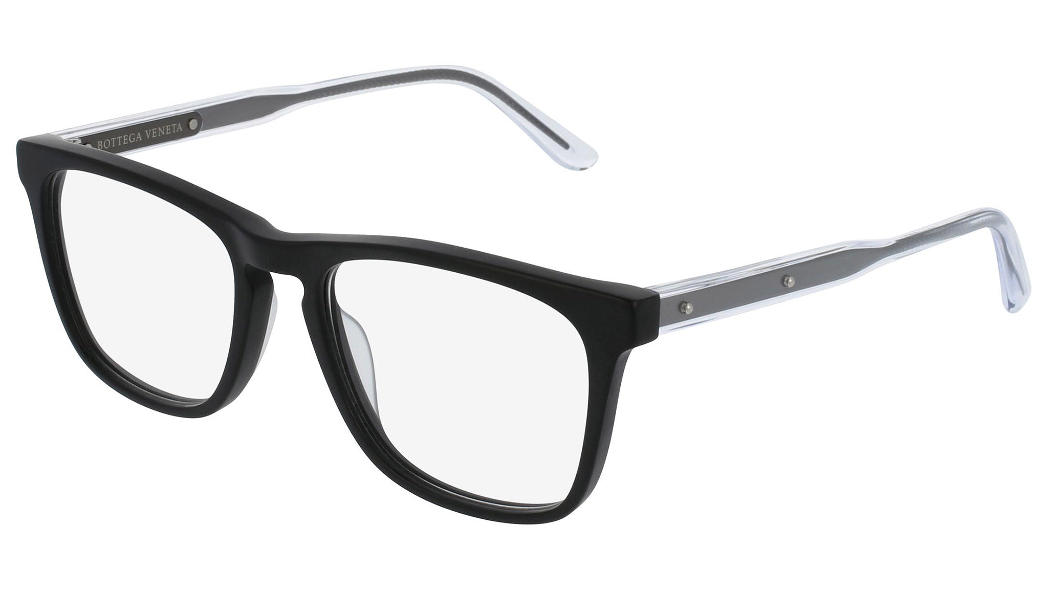 Occhiali da vista Bottega Veneta modello 0048O 001 featuring matte black front frame and crystal temple.