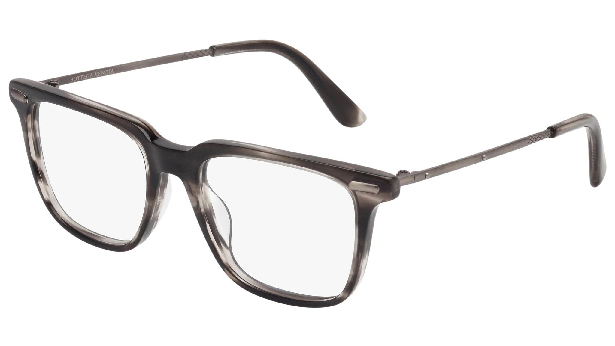 Occhiali da vista Bottega Veneta modello 0049O 003 featuring shiny striped black front frame and silver temple.