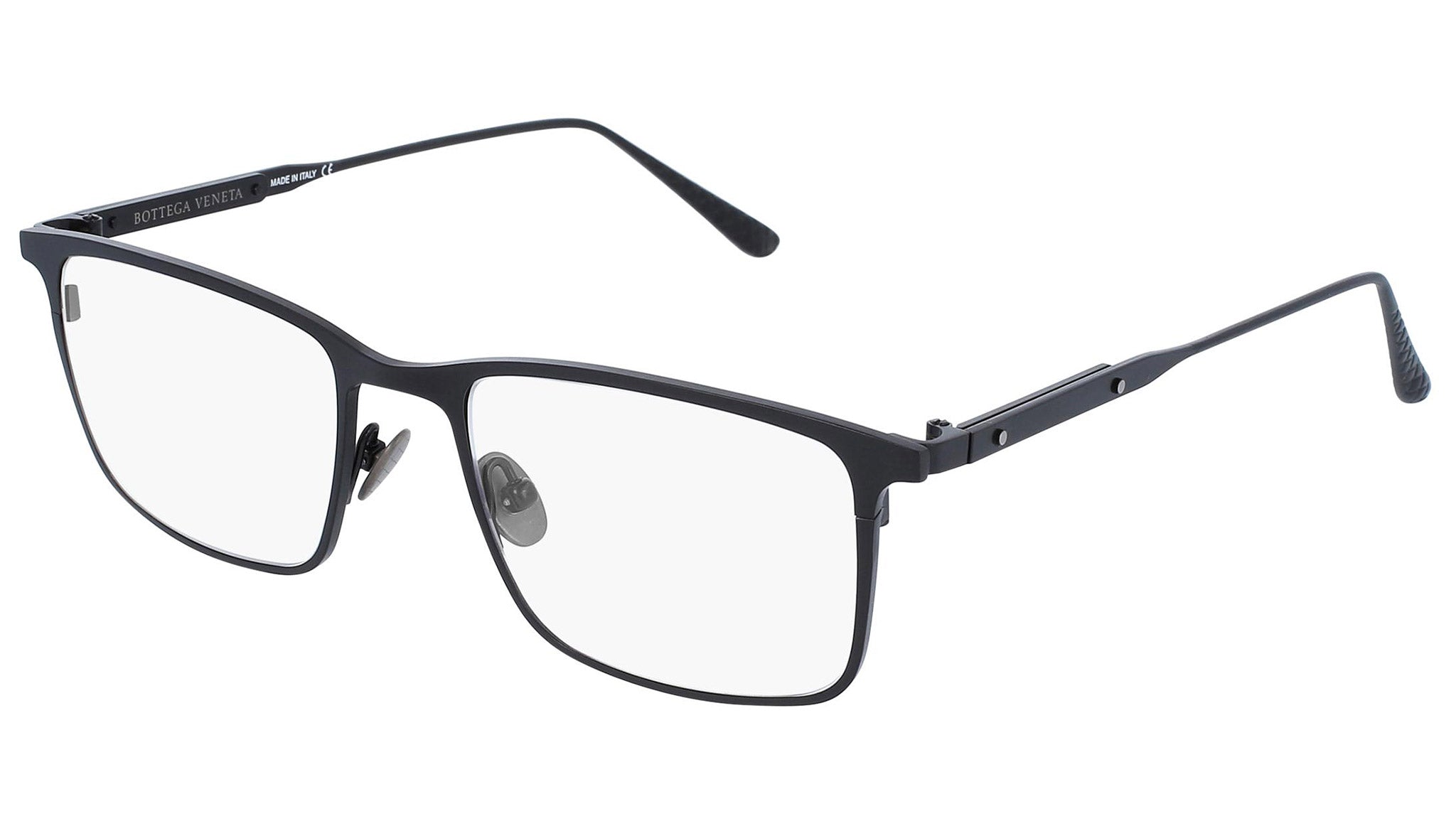 Occhiali da vista Bottega Veneta modello 0054O 001 featuring matte black front frame and black temple.