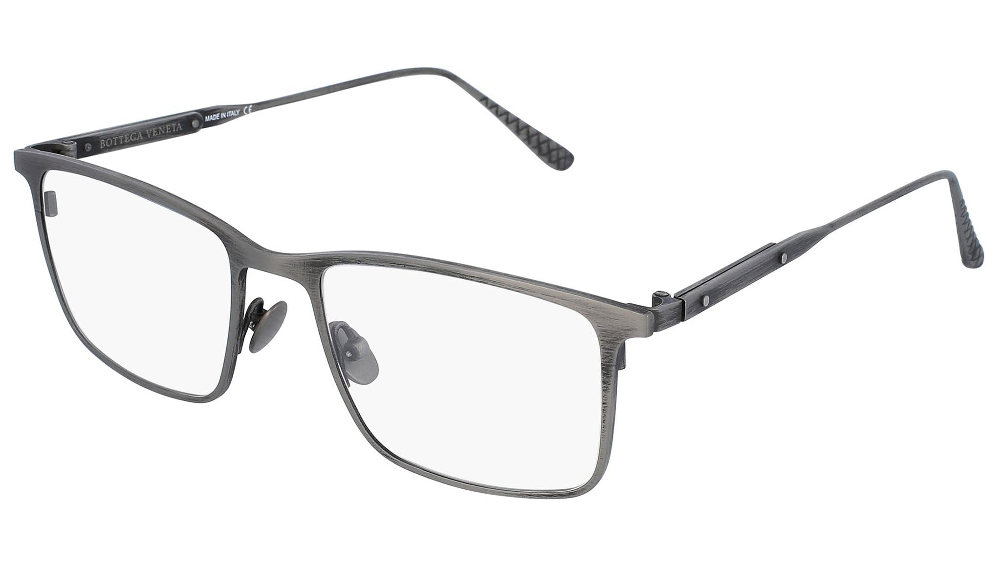 Occhiali da vista Bottega Veneta modello 0054O 002 featuring semimatte antique silver front frame and silver temple.