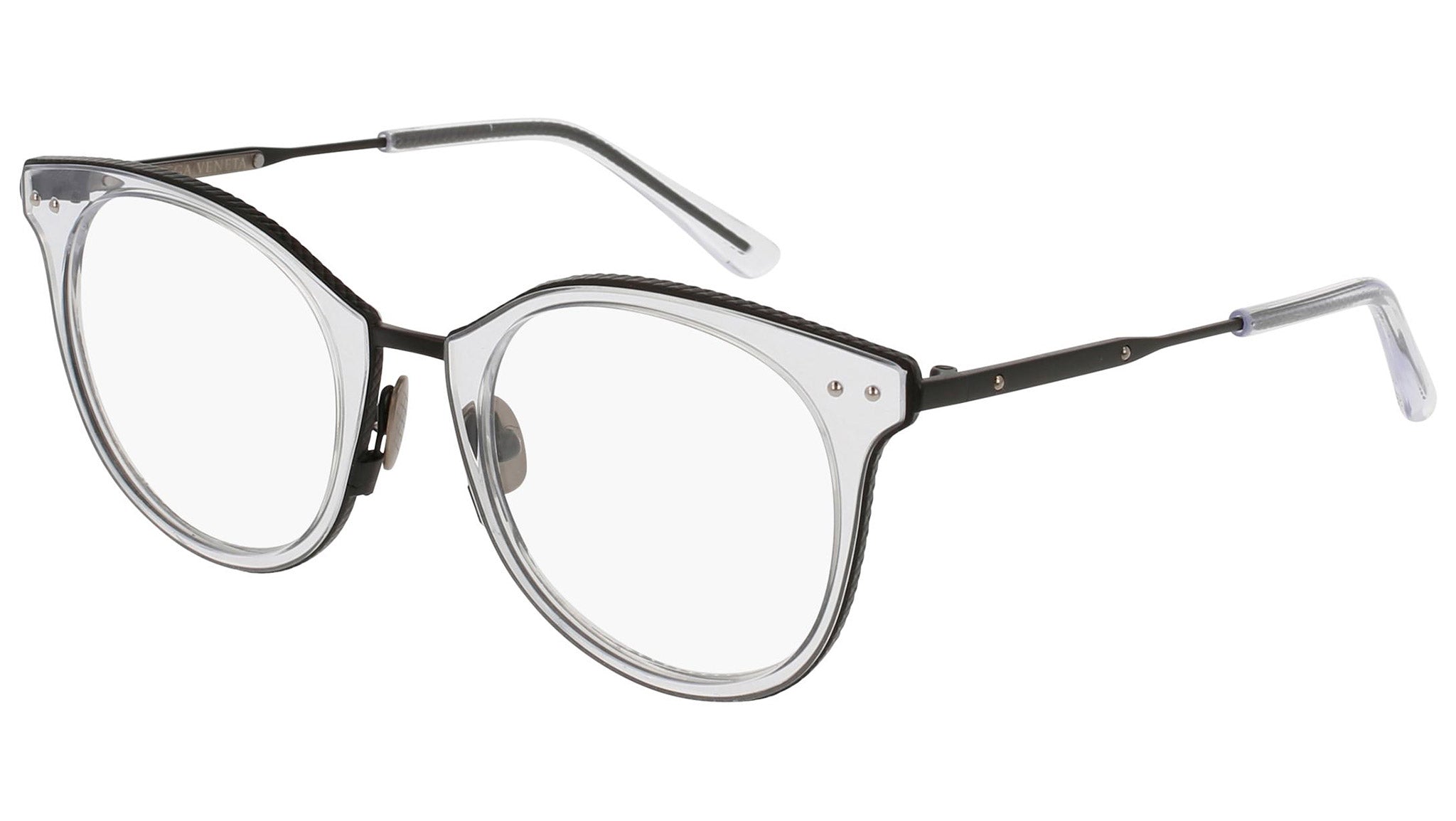 Occhiali da vista Bottega Veneta modello 0066O 003 featuring shiny crystal and matte front frame and black temple.