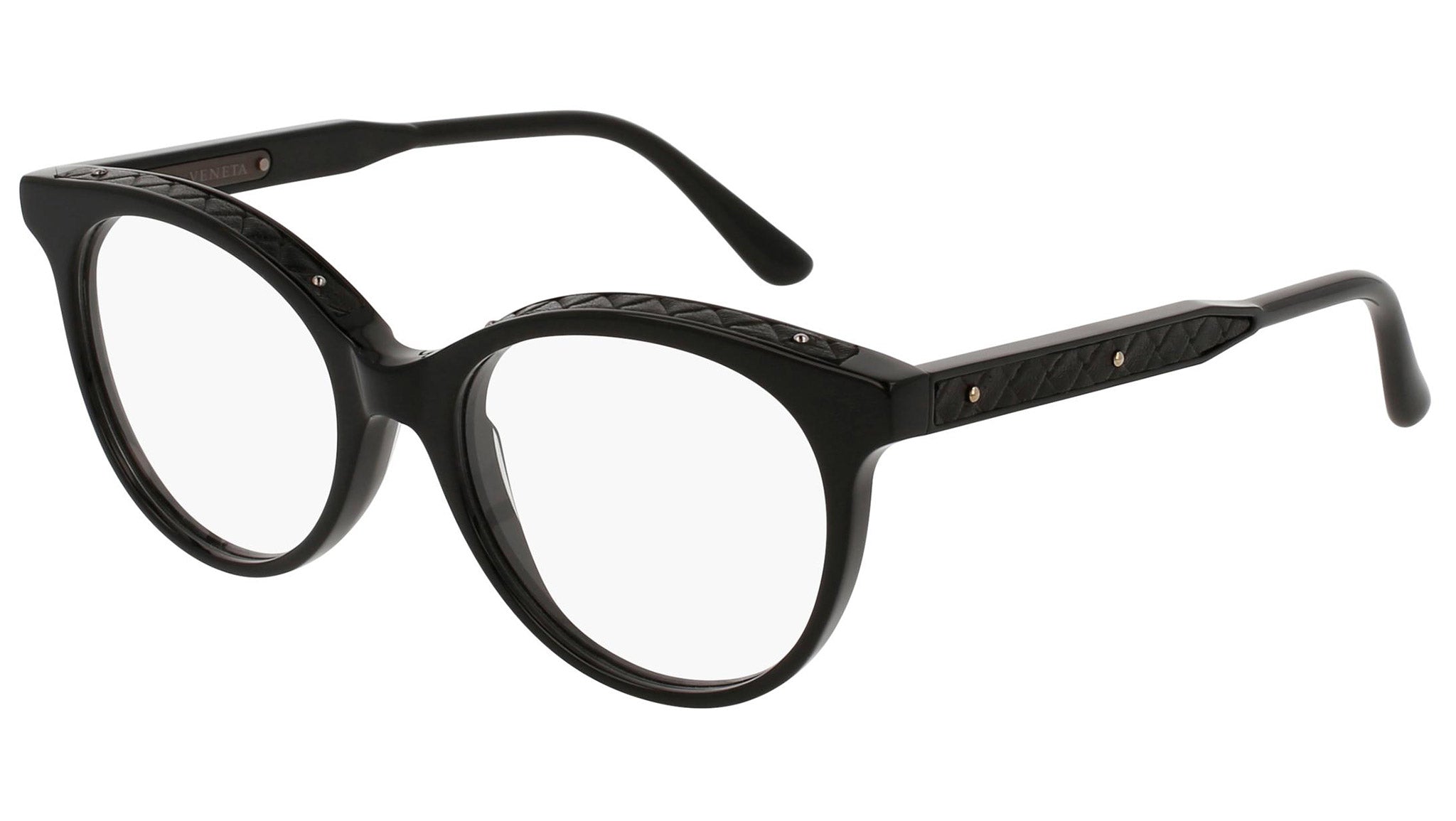 Occhiali da vista Bottega Veneta modello 0069O 001 featuring shiny black and black front frame and black temple.