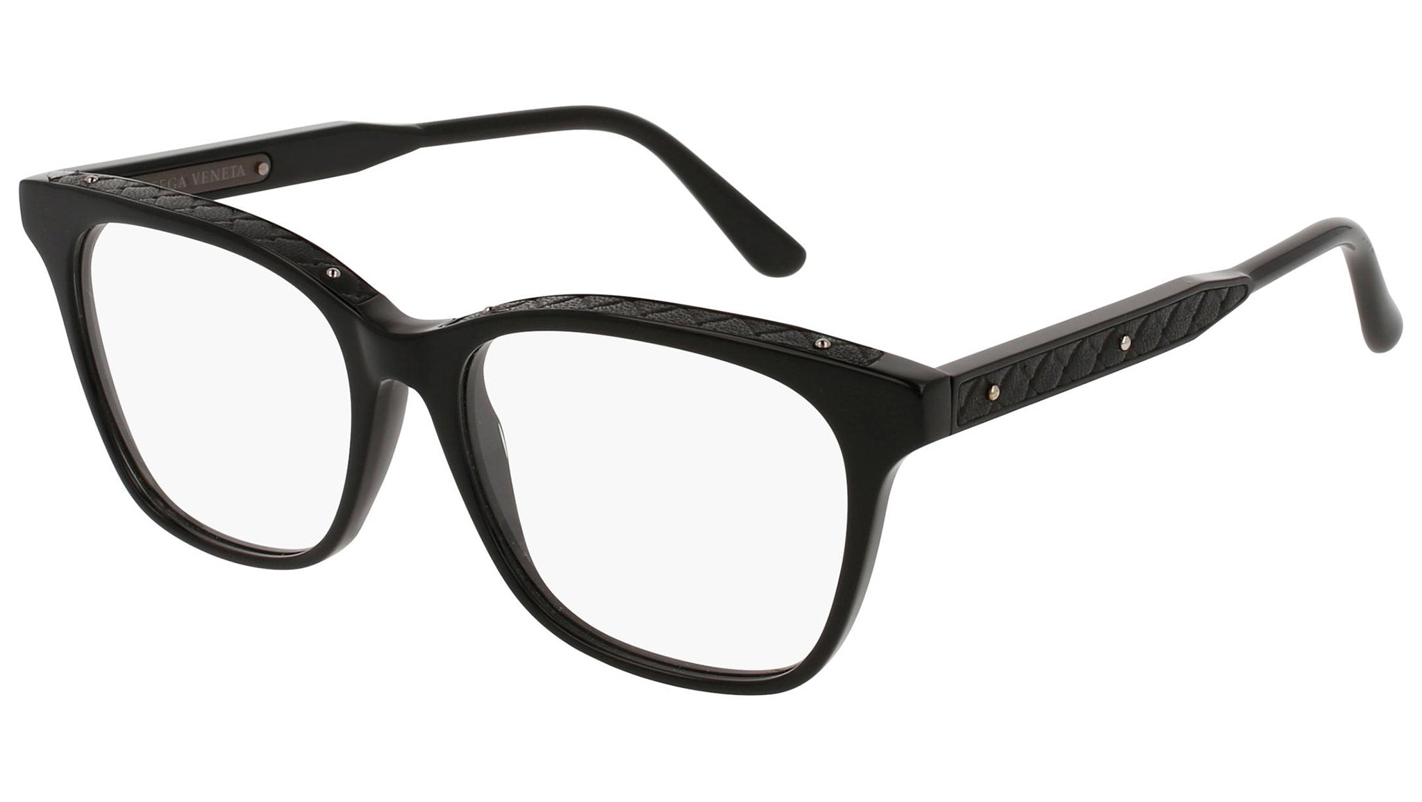 Occhiali da vista Bottega Veneta modello 0070O 001 featuring shiny black and black front frame and black temple.