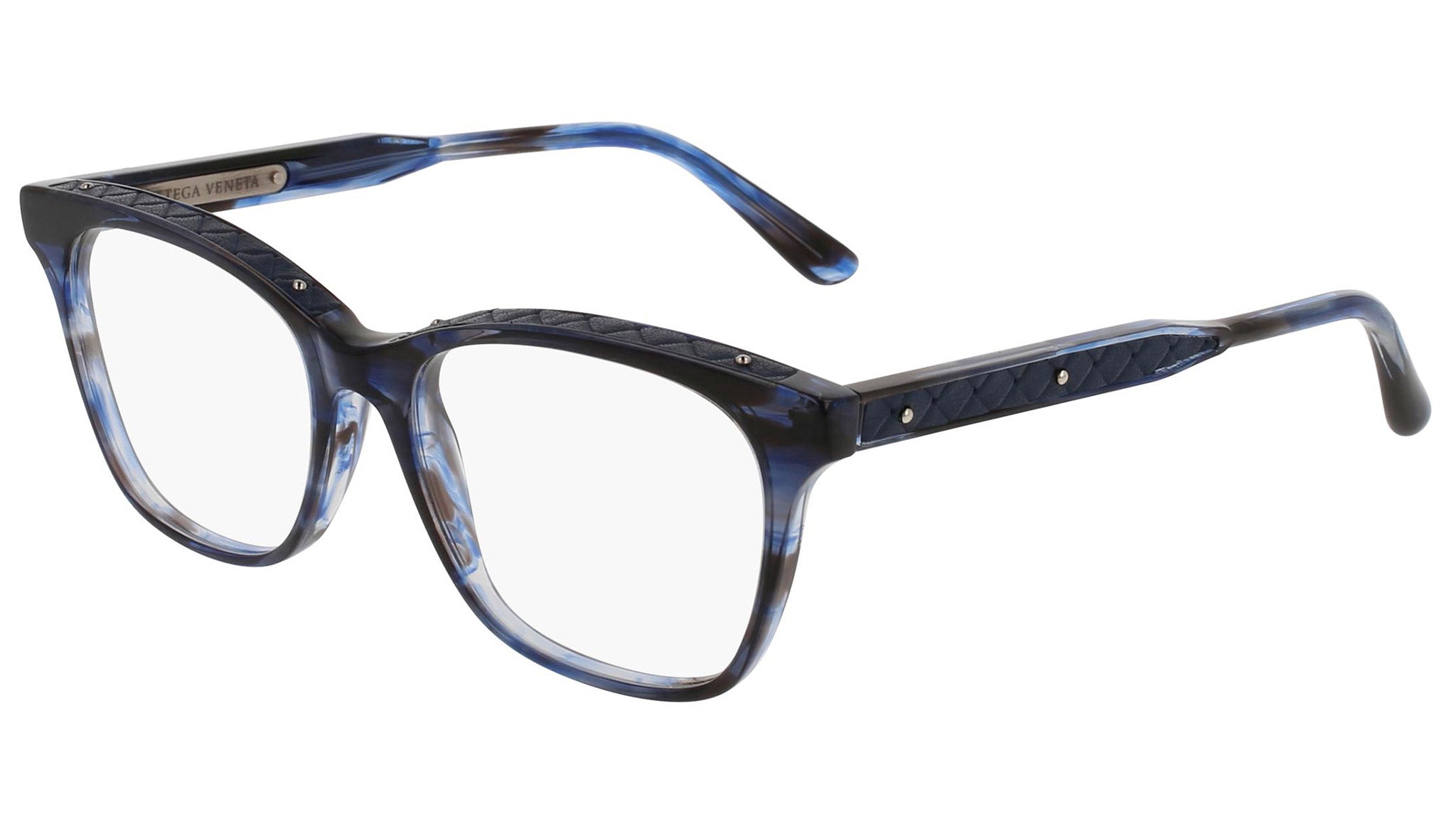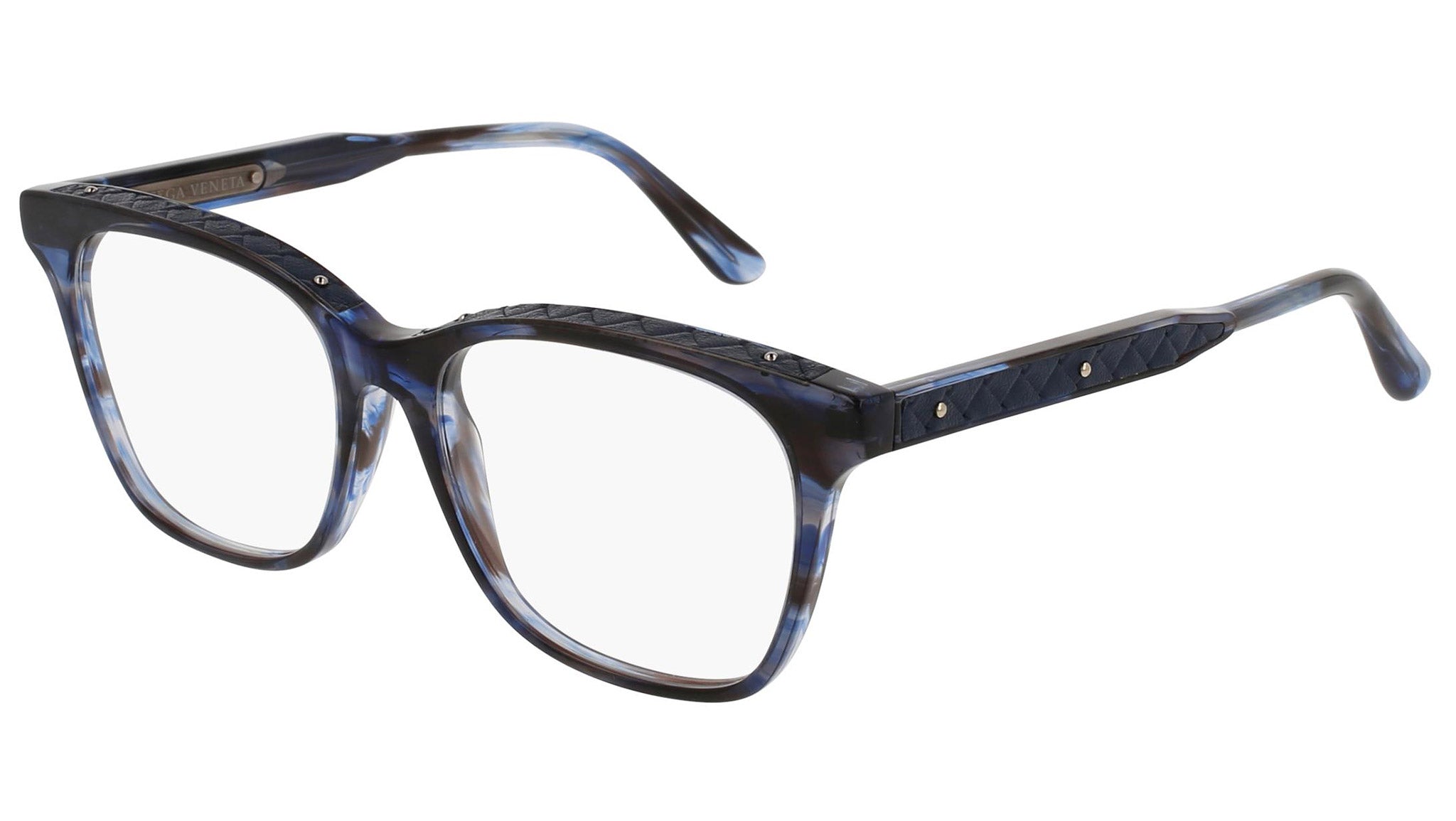 Occhiali da vista Bottega Veneta modello 0070O 003 featuring melange blue and pacific blue front frame and blue temple.