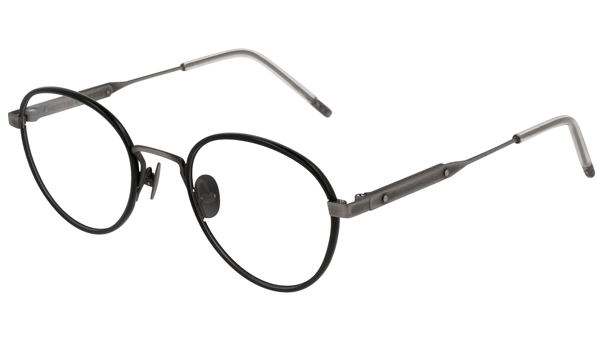 Occhiali da vista Bottega Veneta modello 0077O 002 featuring antique silver and trasp front frame and silver temple.