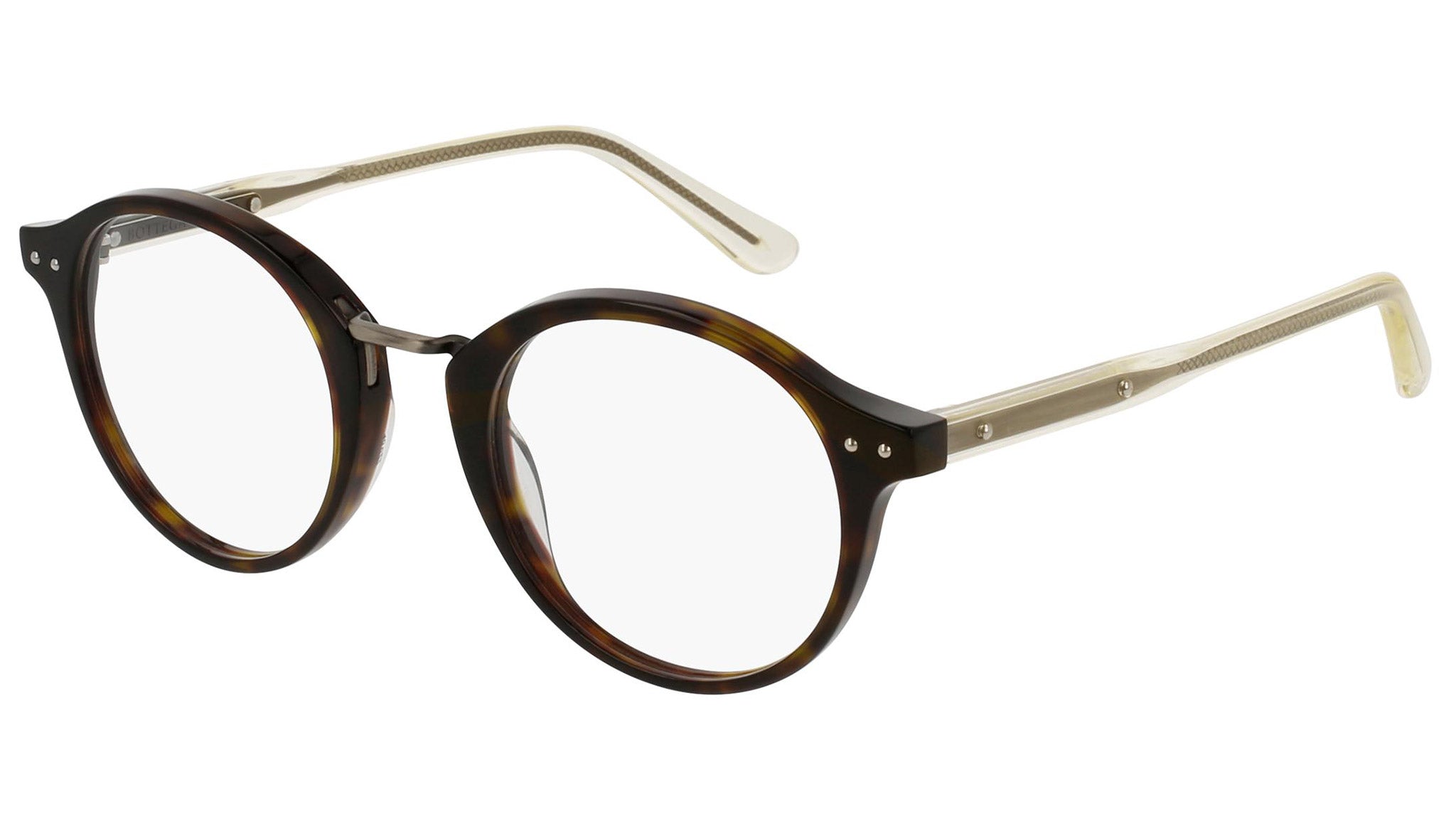 Occhiali da vista Bottega Veneta modello 0080O 003 featuring shiny dark havana front frame and yellow temple.