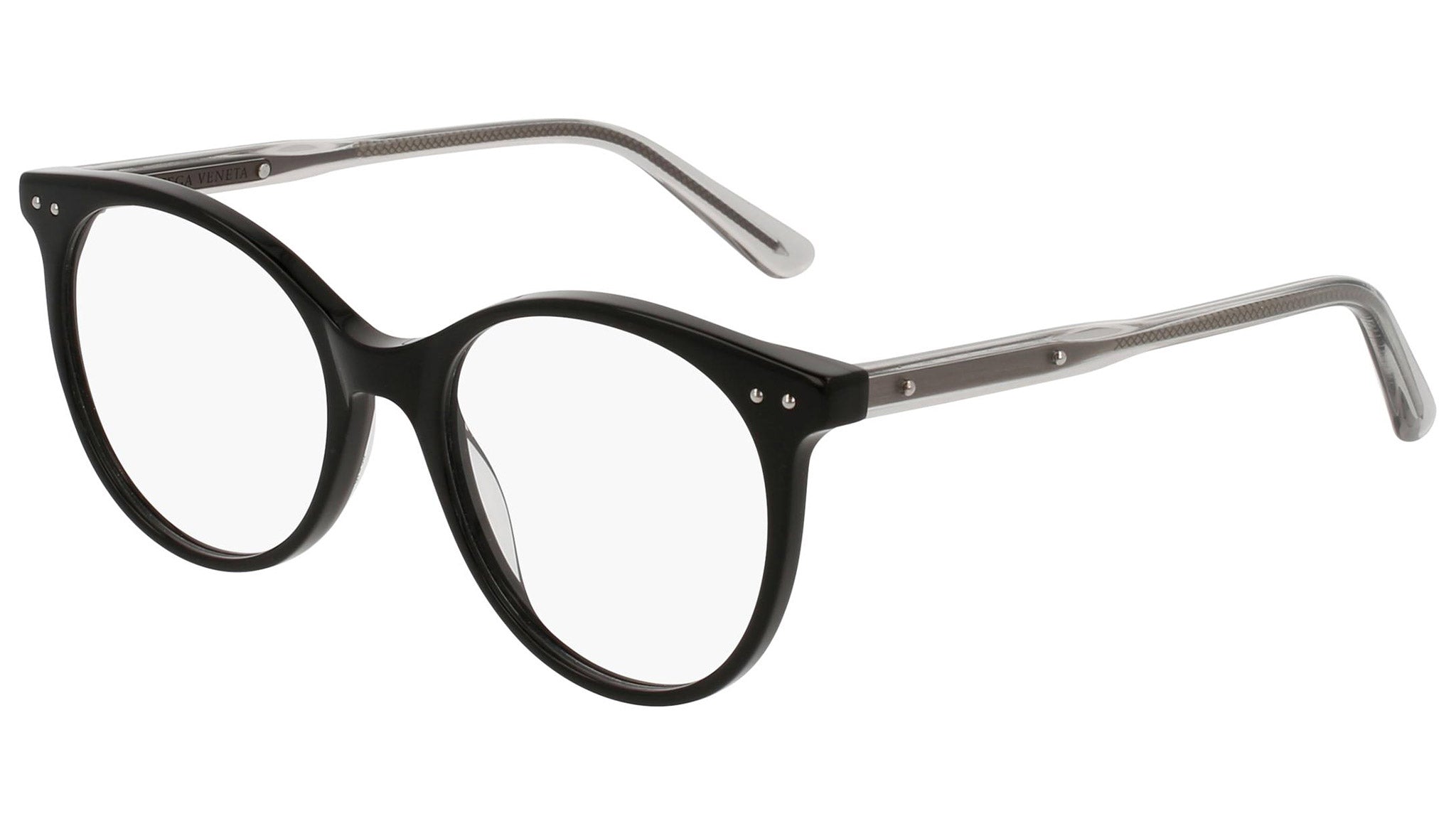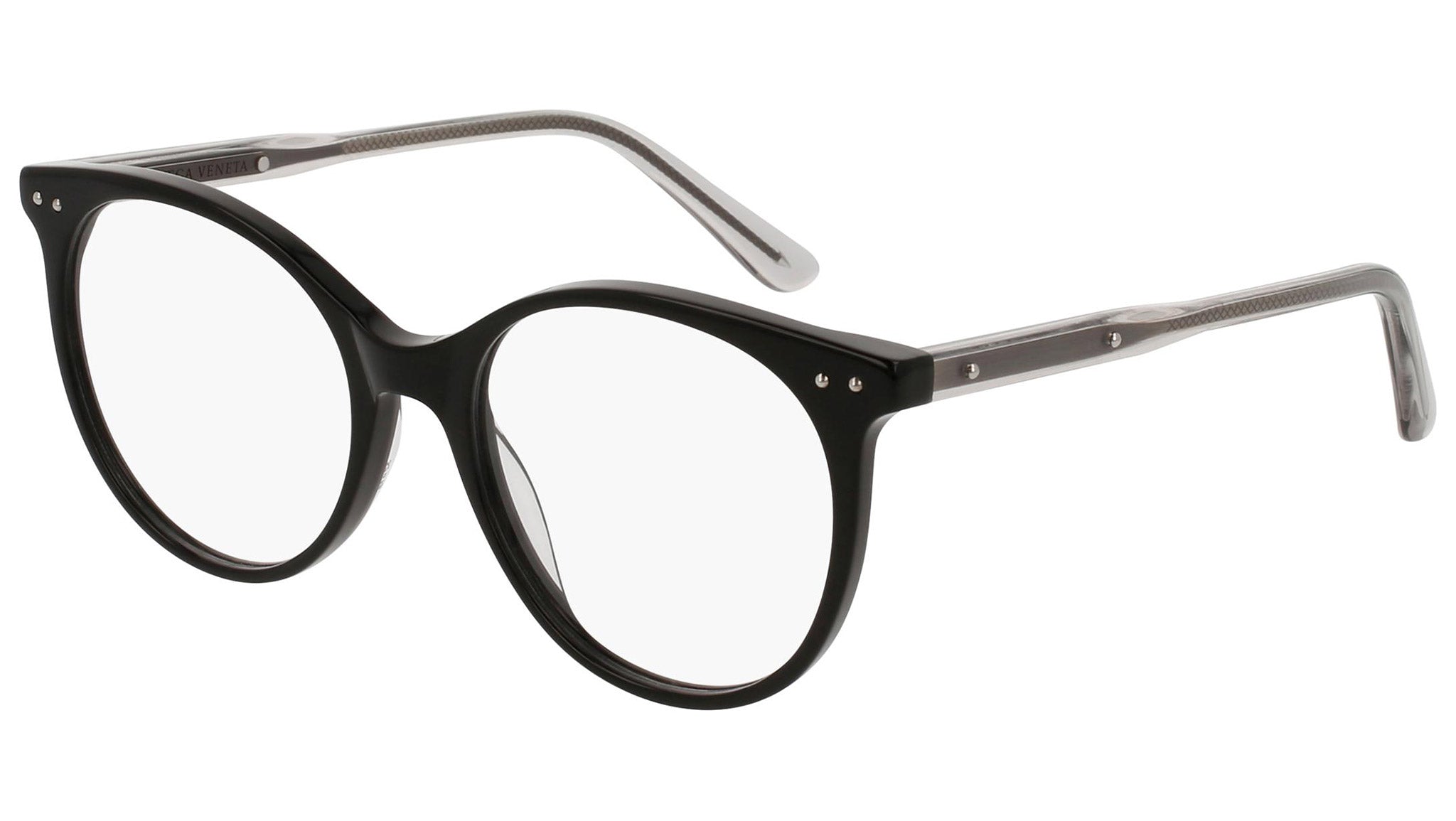 Occhiali da vista Bottega Veneta modello 0081O 001 featuring shiny black front frame and grey temple.