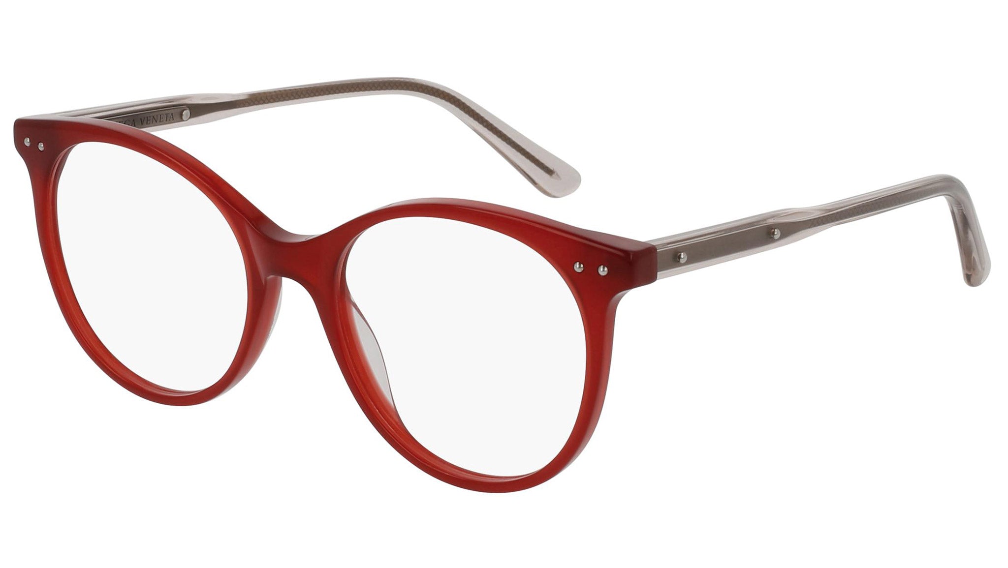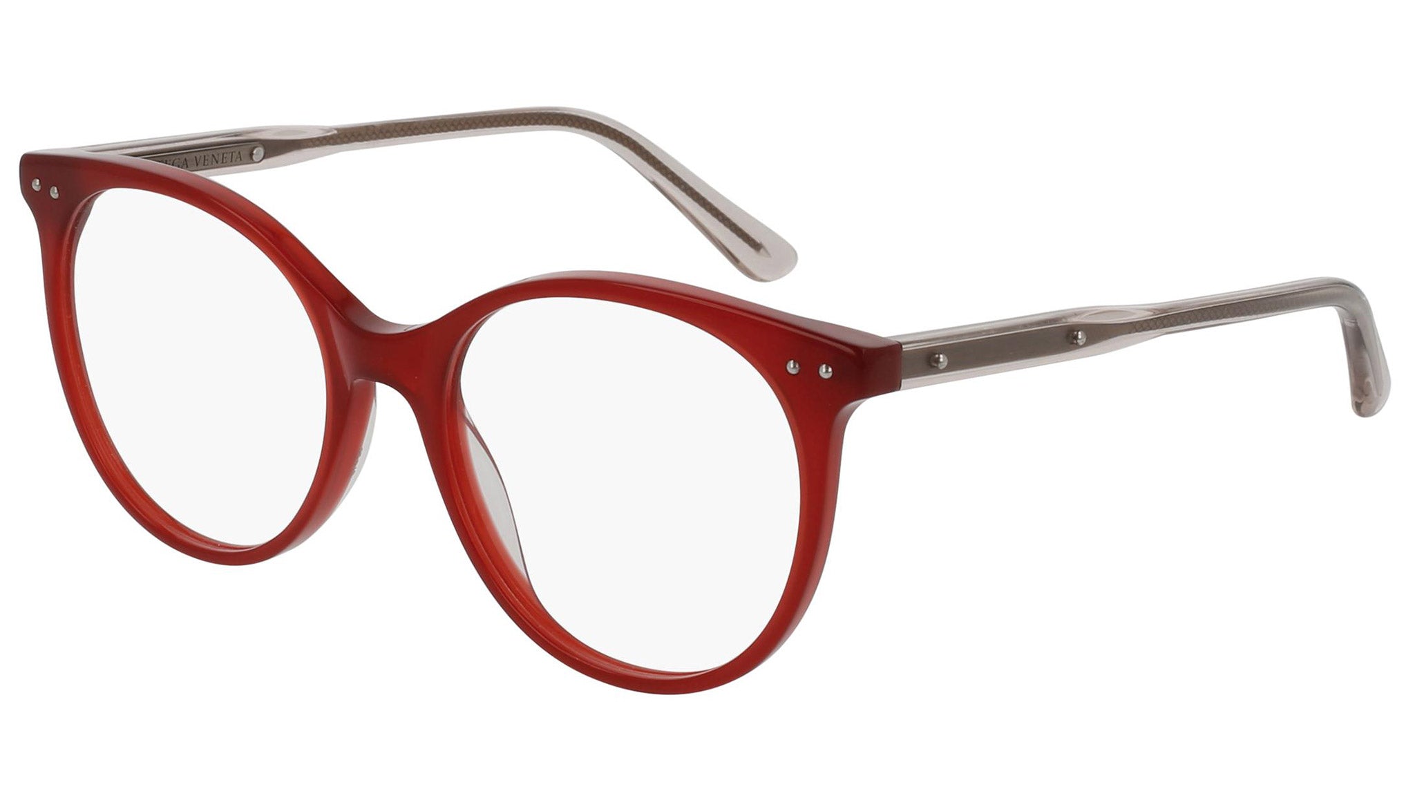 Occhiali da vista Bottega Veneta modello 0081O 003 featuring shiny opal bordeaux front frame and pink temple.