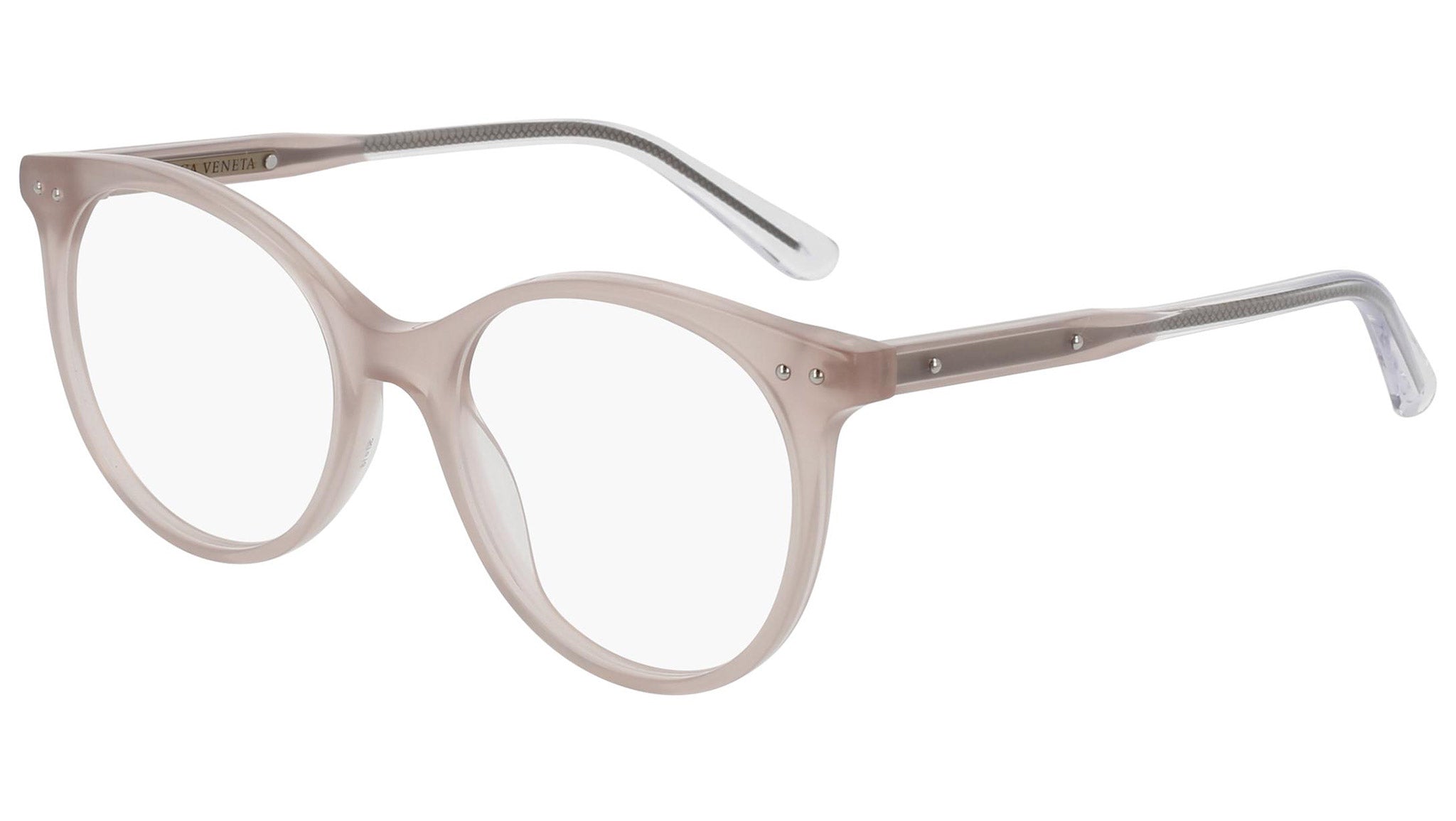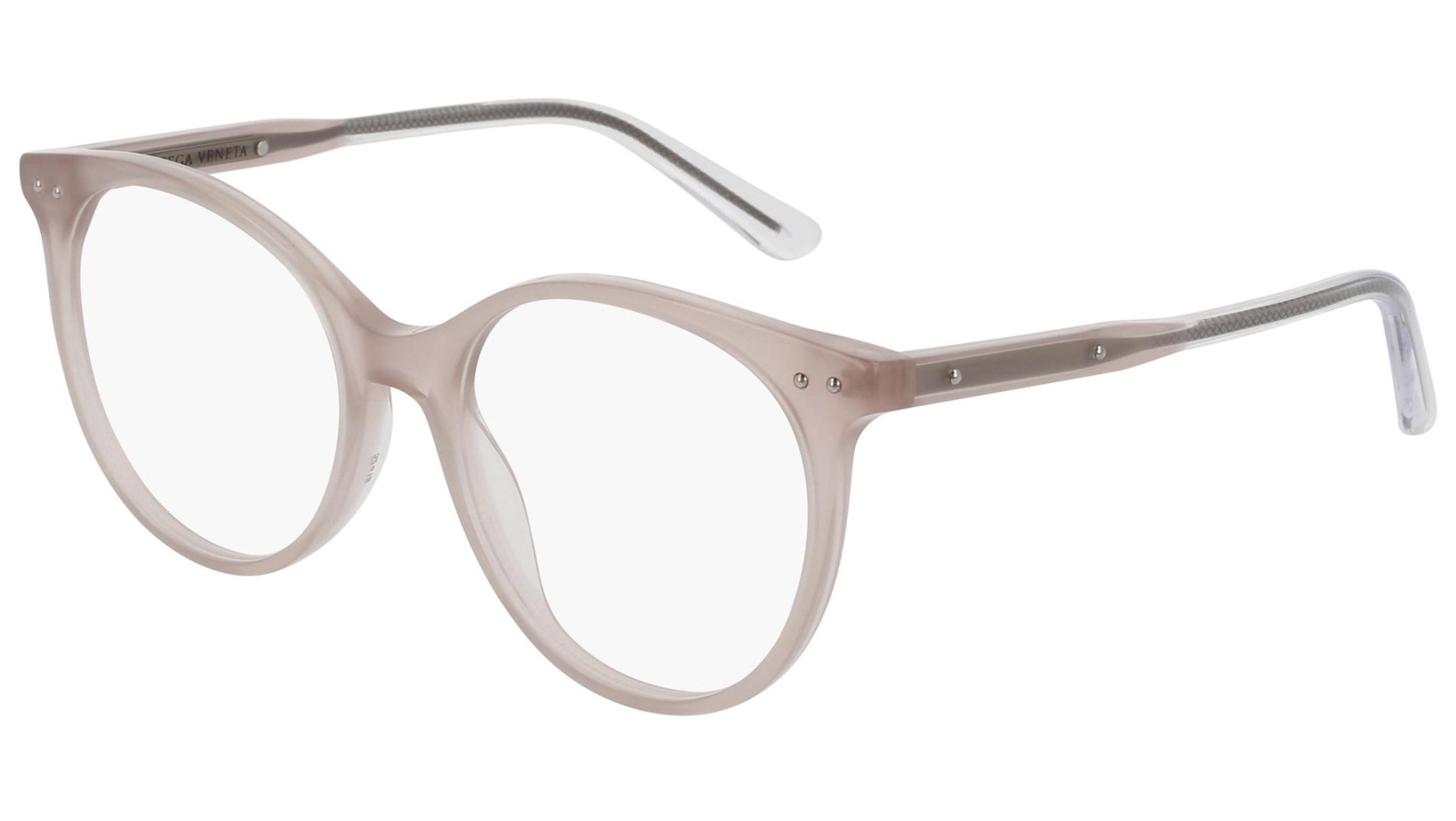 Occhiali da vista Bottega Veneta modello 0081O 004 featuring shiny opal pink front frame and pink temple.