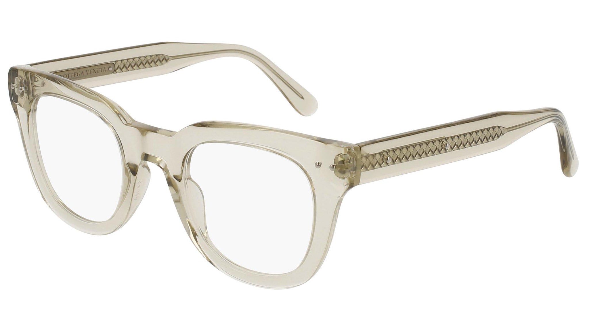 Occhiali da vista Bottega Veneta modello 0084O 002 featuring shiny transparent mu front frame and brown temple.
