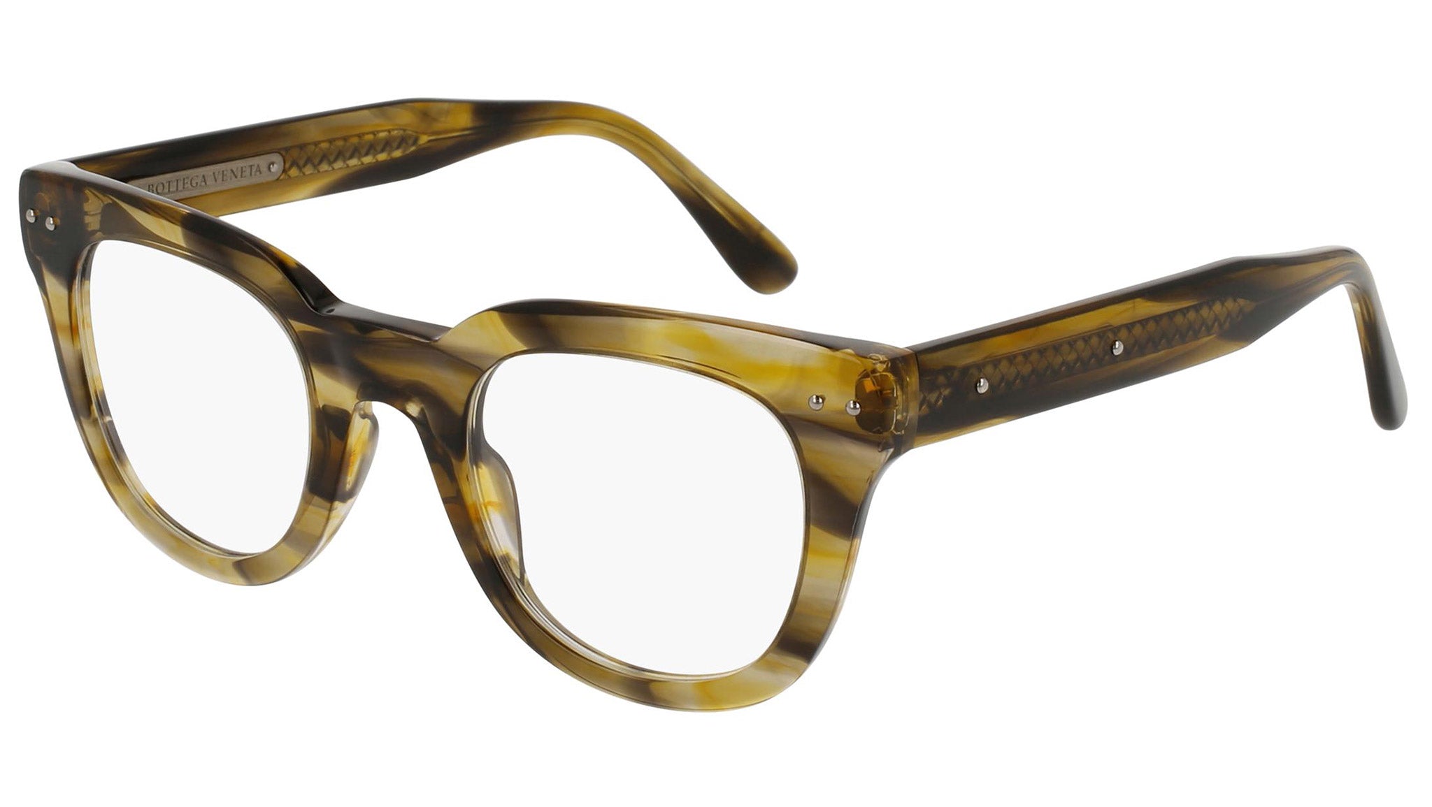 Occhiali da vista Bottega Veneta modello 0084O 005 featuring shiny melange brown front frame and brown temple.