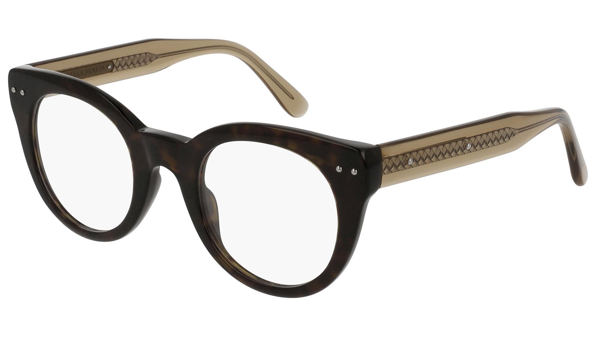 Occhiali da vista Bottega Veneta modello 0085O 002 featuring shiny dark havana front frame and red temple.