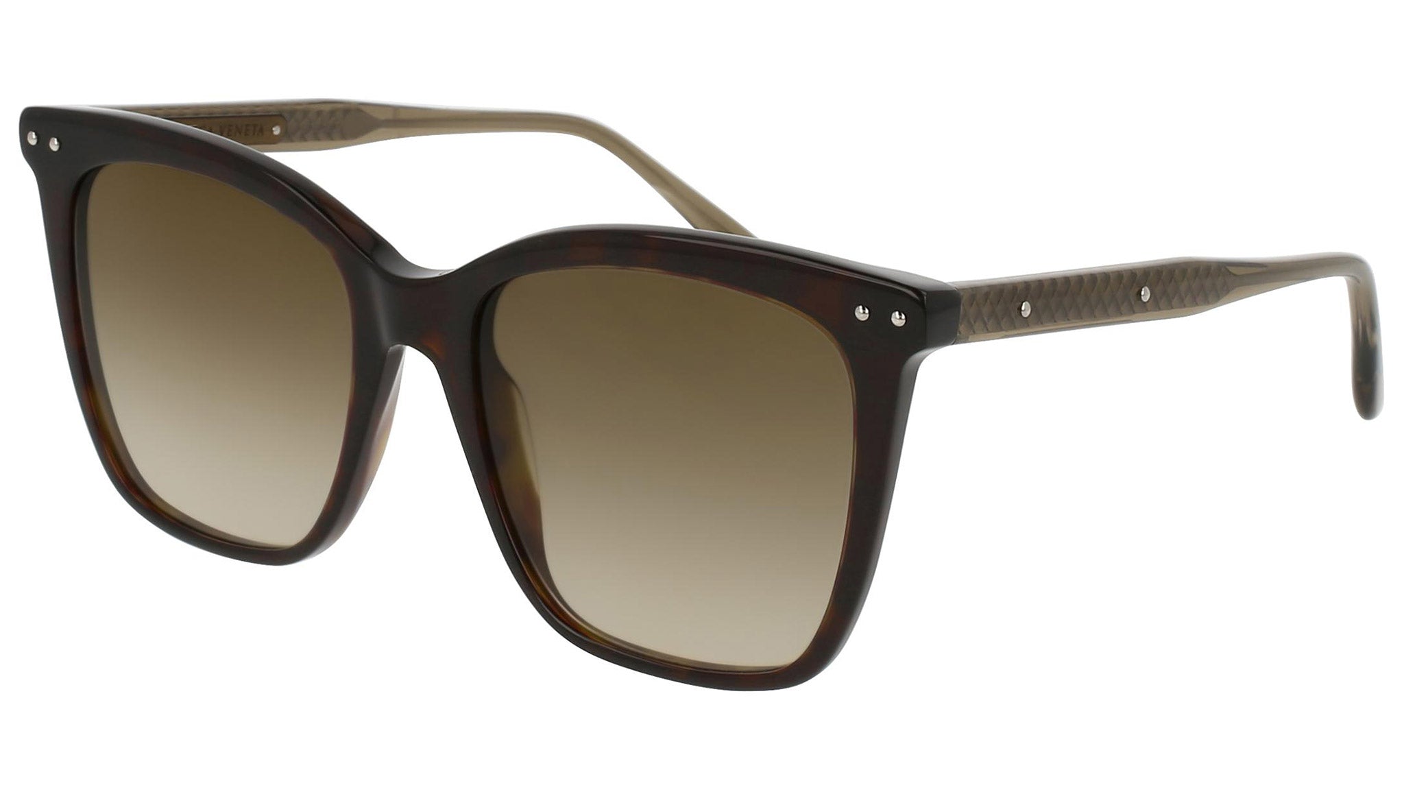 Bottega Veneta sunglasses collection model 0097S 005 featuring shiny dark havana front frame and gradient brown lens. Inspired by Italian culture with a global outlook, the House is defined by a distinctly refined attitude. Bottega Veneta uses noble materials to create considered pieces that become part of their owner’s lives.
