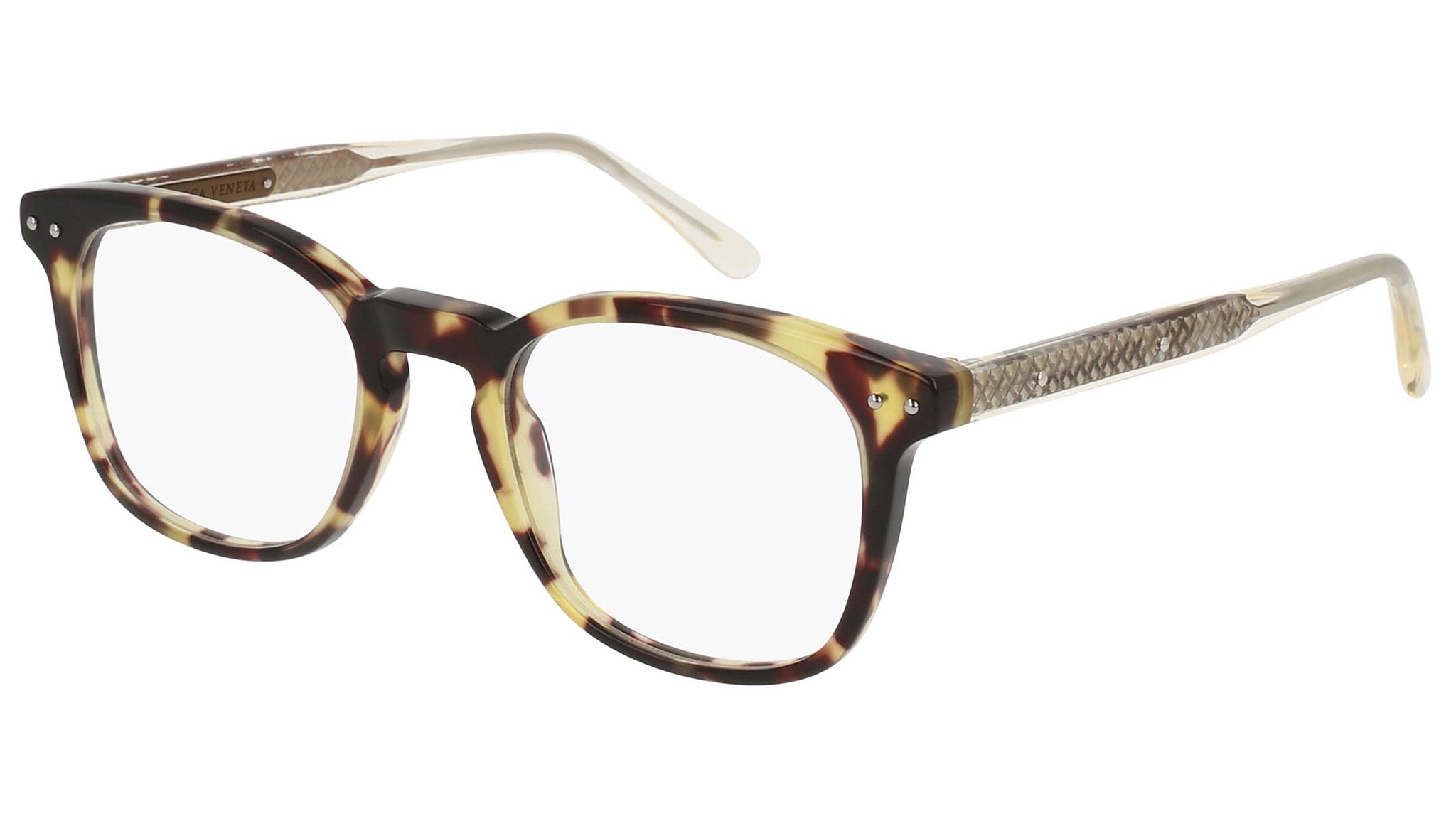 Occhiali da vista Bottega Veneta modello 0100O 005 featuring shiny spotted brown havana front frame and yellow temple.