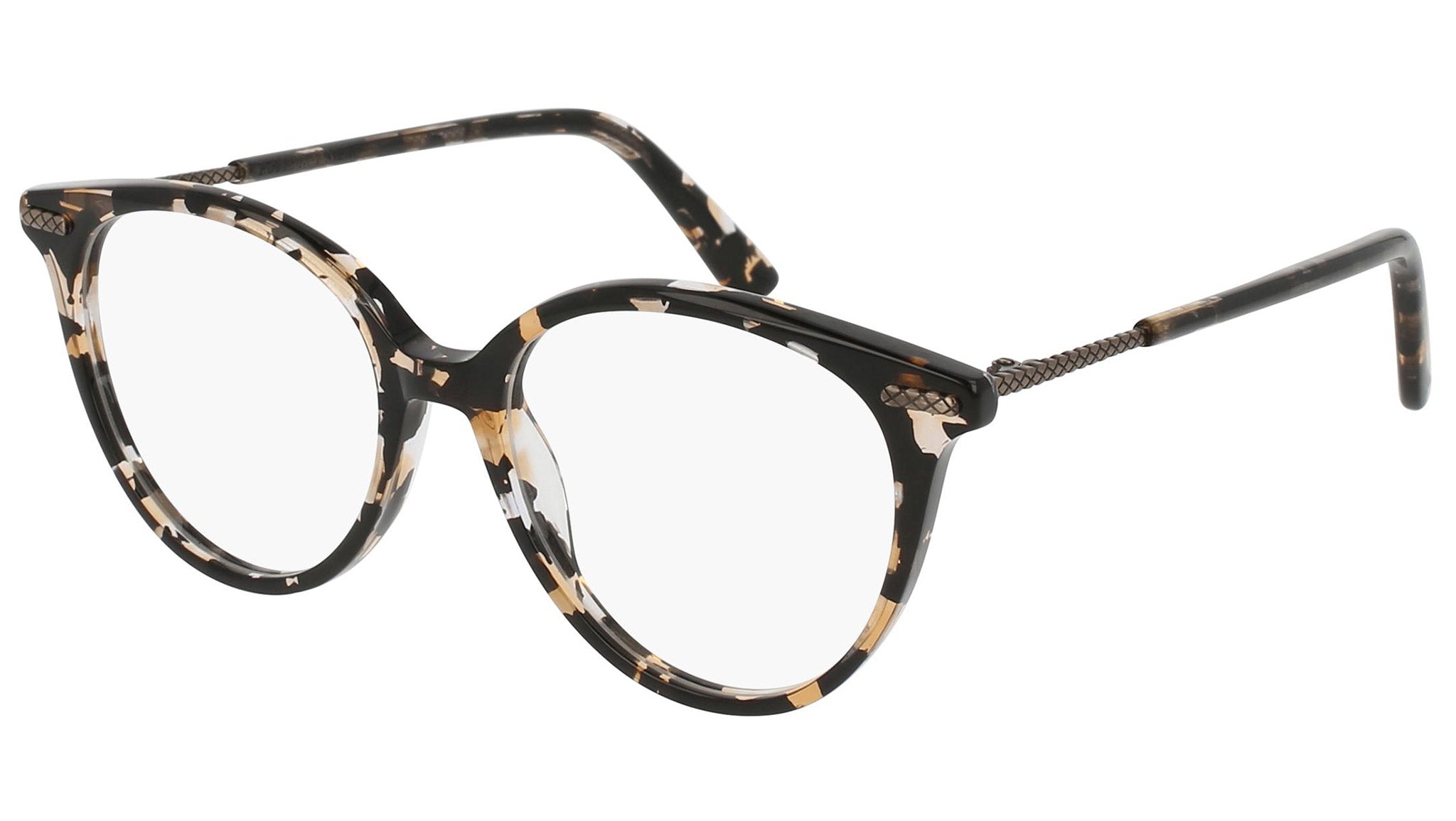 Occhiali da vista Bottega Veneta modello 0105O 003 featuring shiny black and orange havana front frame and silver temple.