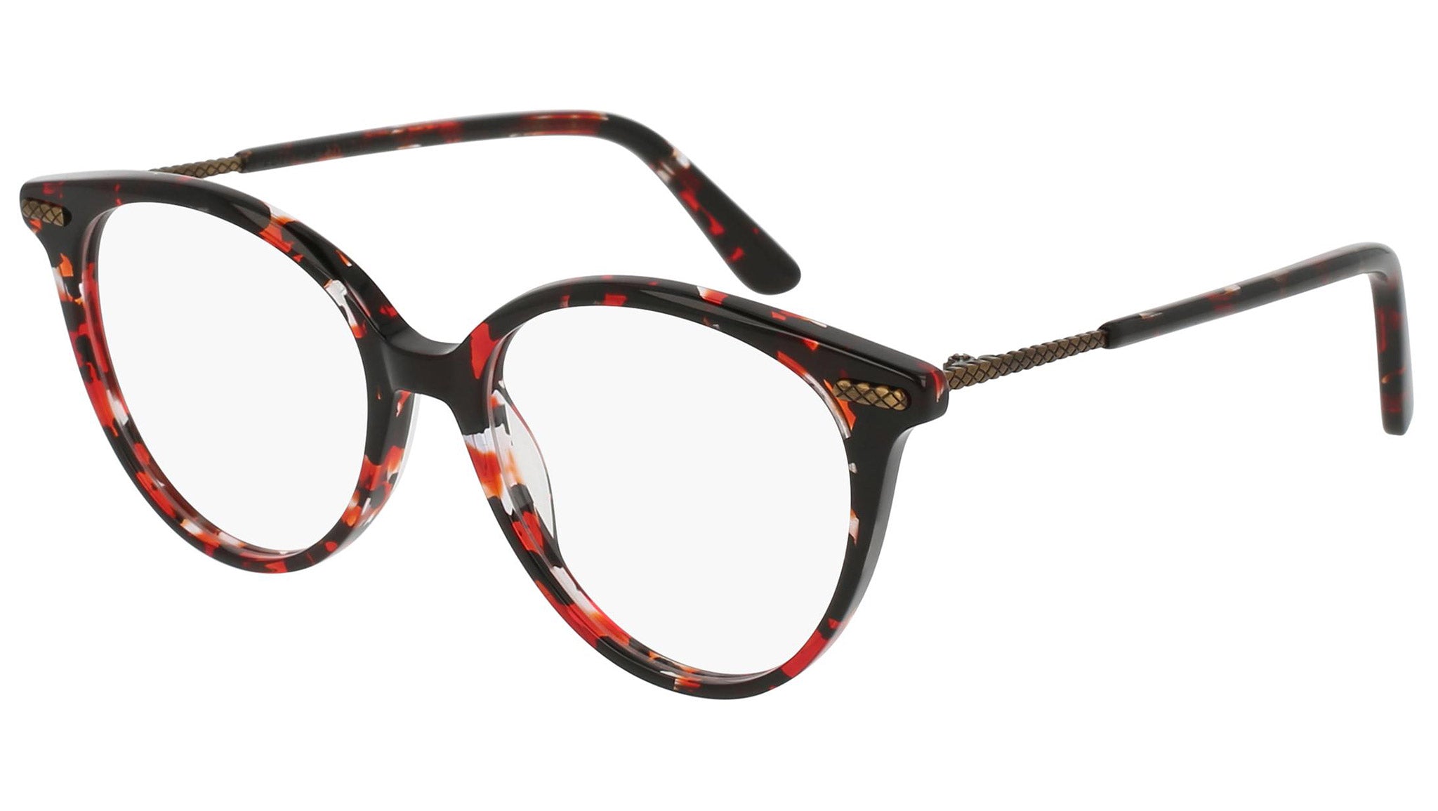 Occhiali da vista Bottega Veneta modello 0105O 004 featuring shiny black and red havana front frame and bronze temple.