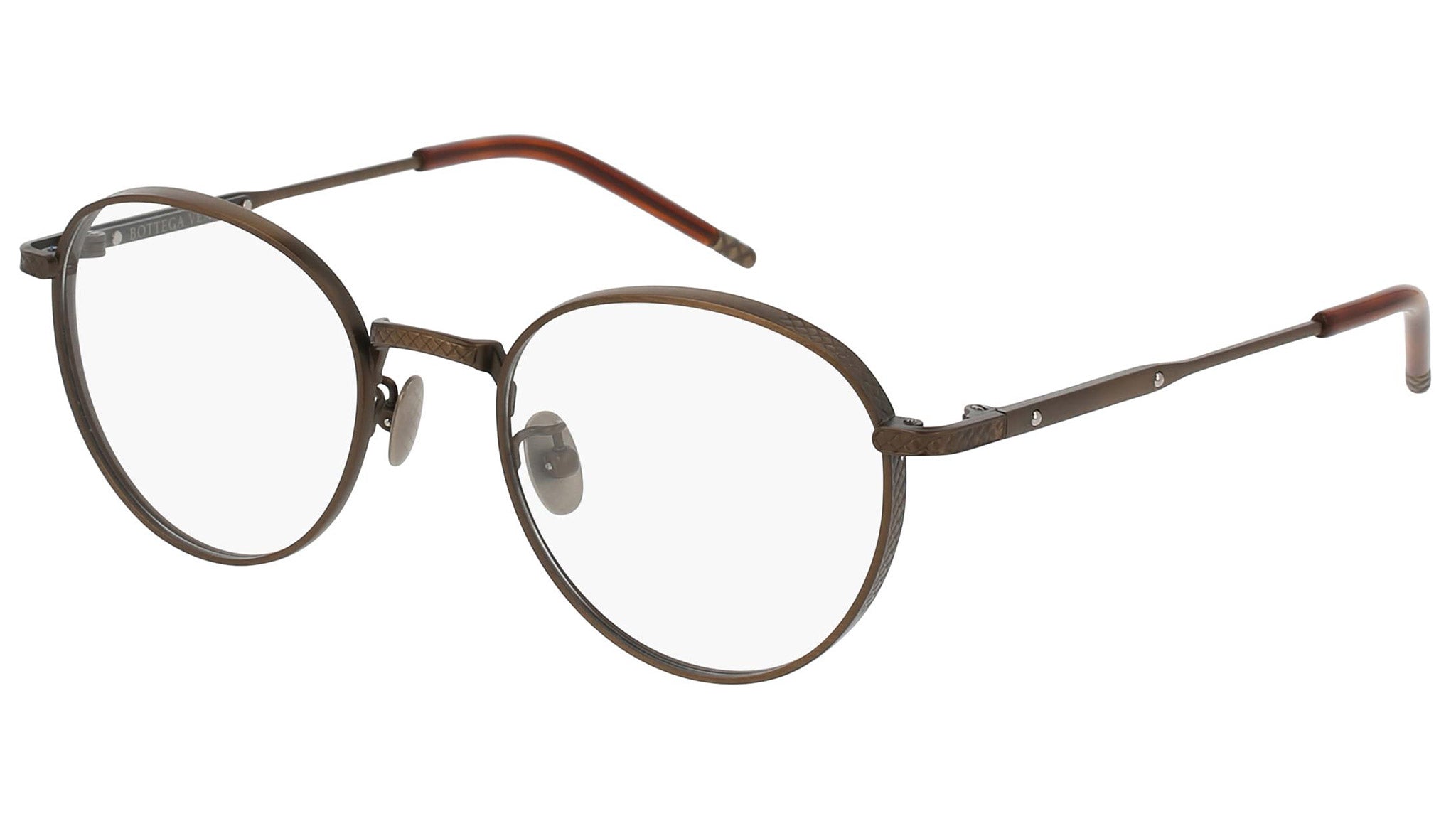 Occhiali da vista Bottega Veneta modello 0110O 003 featuring semimatte antique brass front frame and bronze temple.