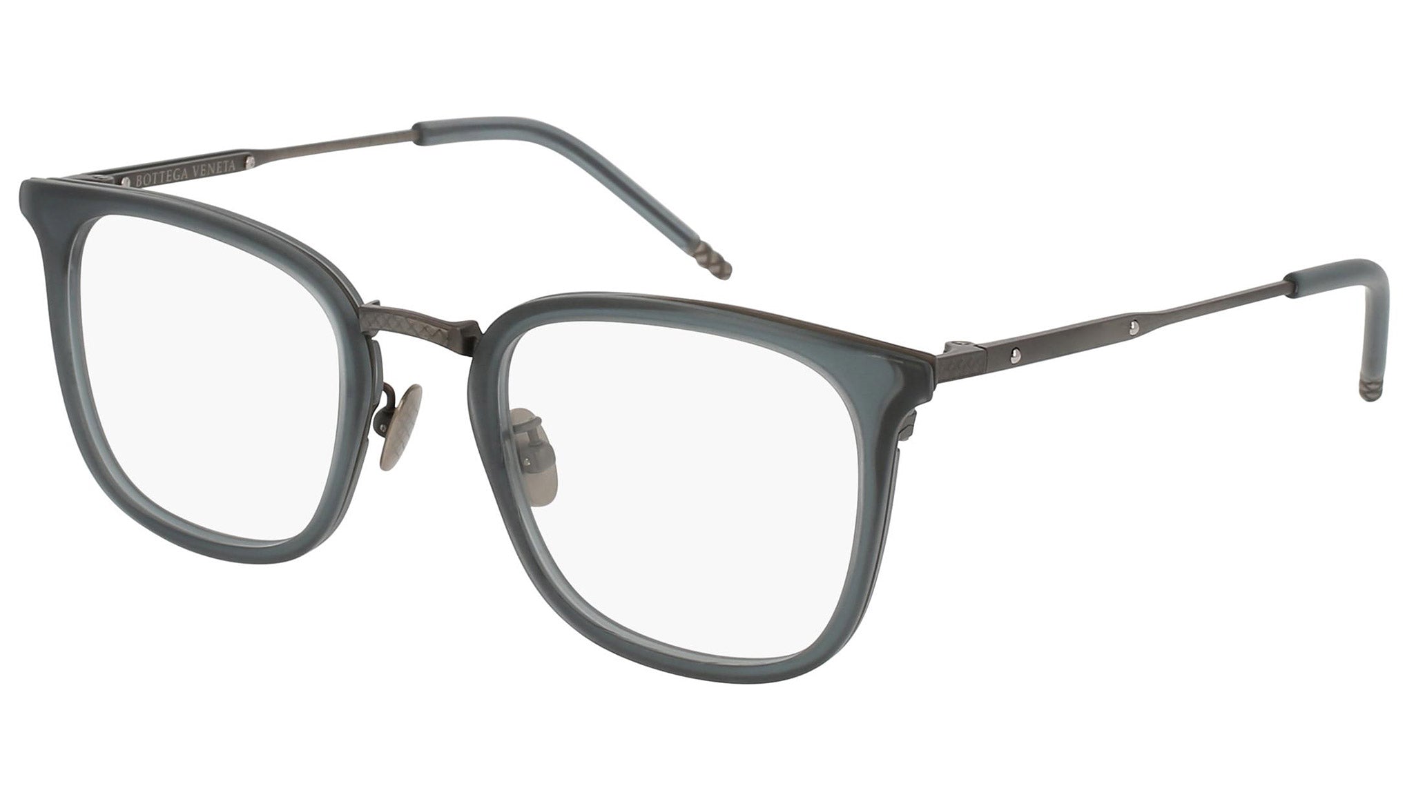 Occhiali da vista Bottega Veneta modello 0111O 003 featuring matte transparent green and semimatte antique silver front frame and silver temple.
