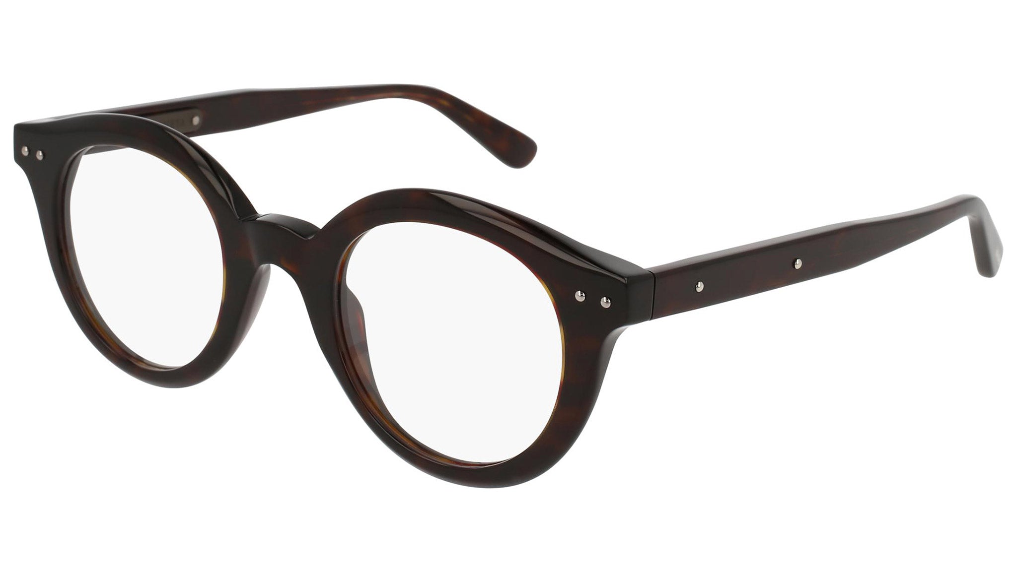 Occhiali da vista Bottega Veneta modello 0114O 003 featuring shiny dark havana front frame and havana temple.