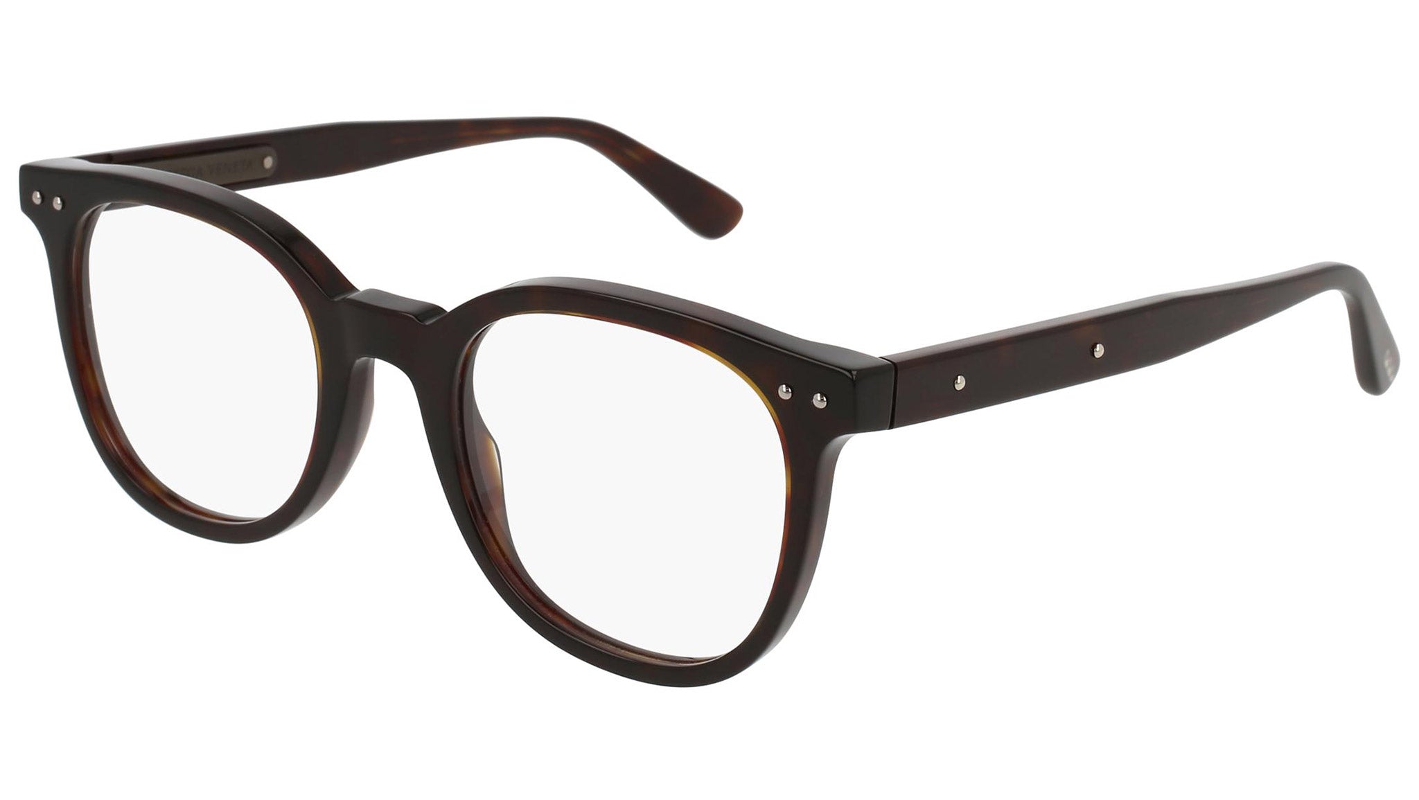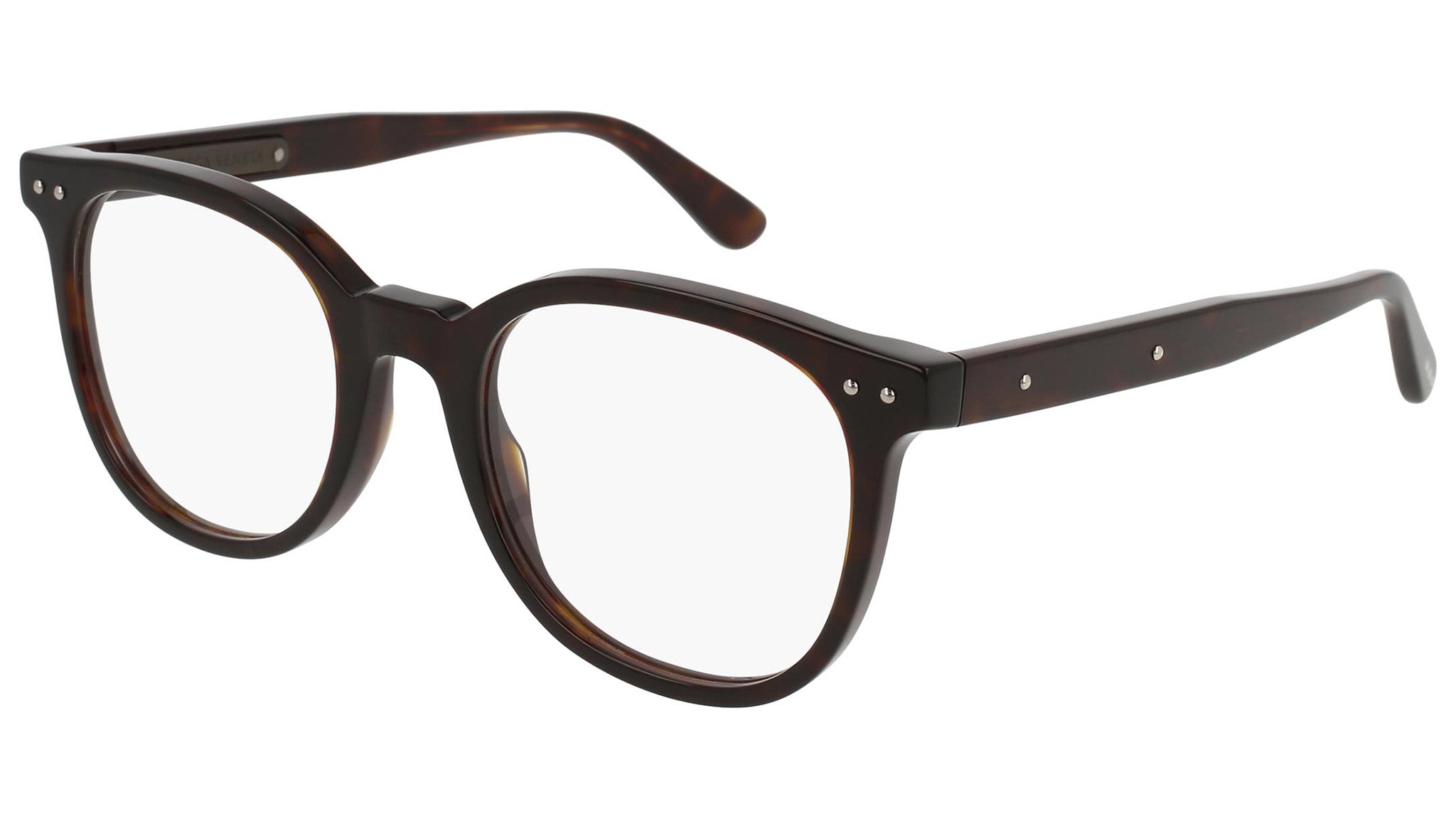Occhiali da vista Bottega Veneta modello 0115O 003 featuring shiny dark havana front frame and havana temple.