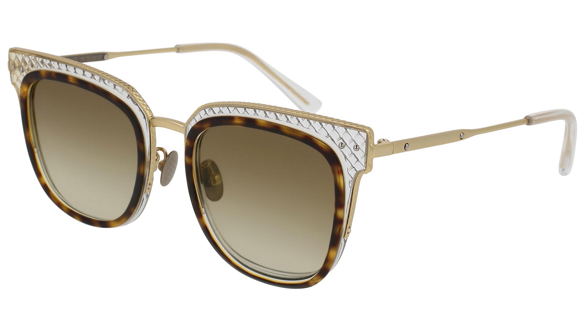Bottega Veneta sunglasses collection model 0122S 002 featuring bilayer shiny classic havana and transparent light yellow front frame and gradient brown lens. Inspired by Italian culture with a global outlook, the House is defined by a distinctly refined attitude. Bottega Veneta uses noble materials to create considered pieces that become part of their owner’s lives.