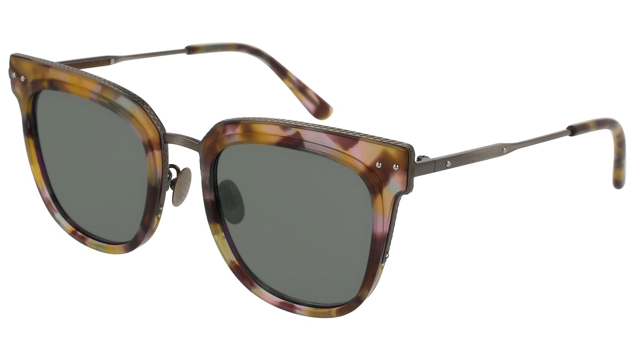 Bottega Veneta sunglasses collection model 0122S 004 featuring shiny spotted milky rose havana front frame and mirror silver lens. Inspired by Italian culture with a global outlook, the House is defined by a distinctly refined attitude. Bottega Veneta uses noble materials to create considered pieces that become part of their owner’s lives.