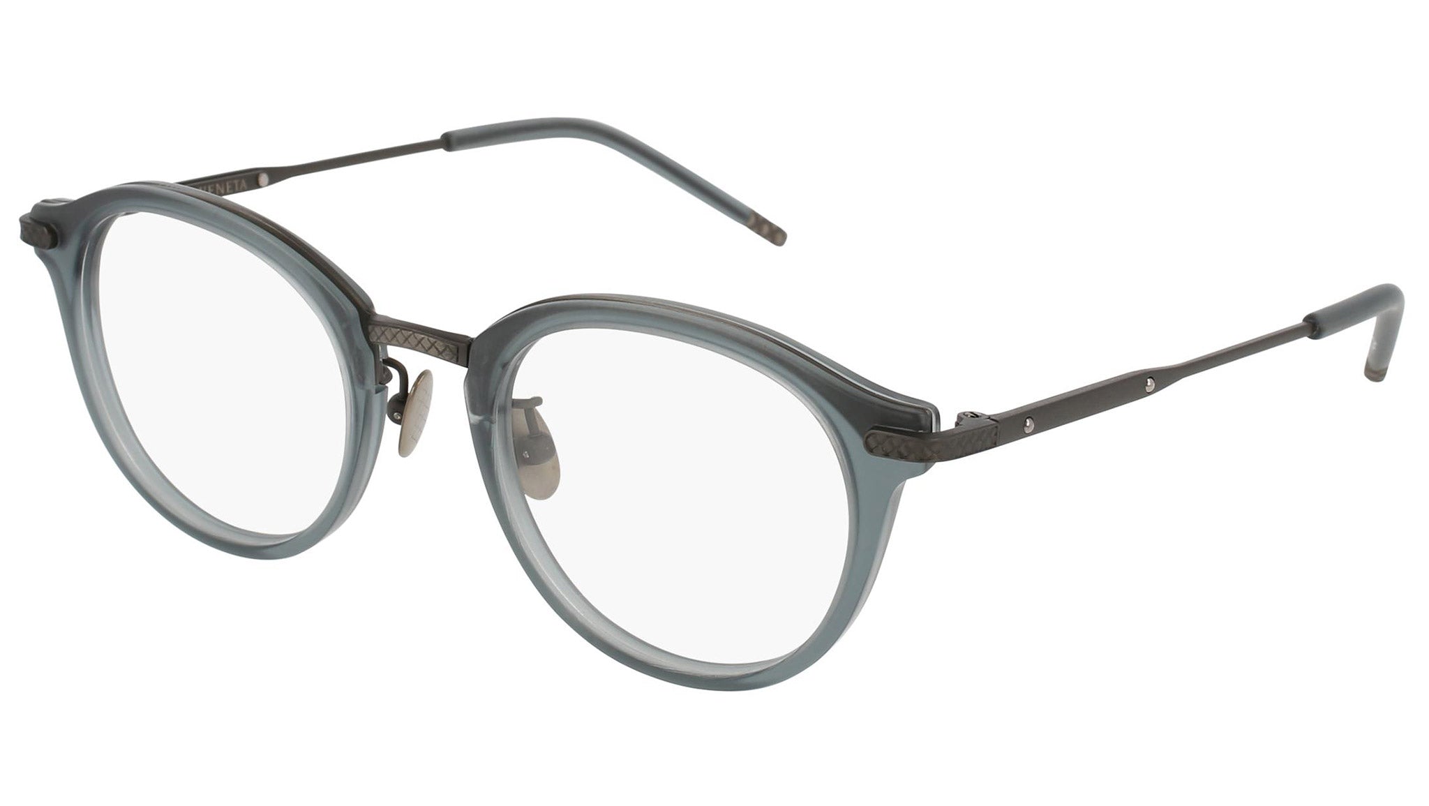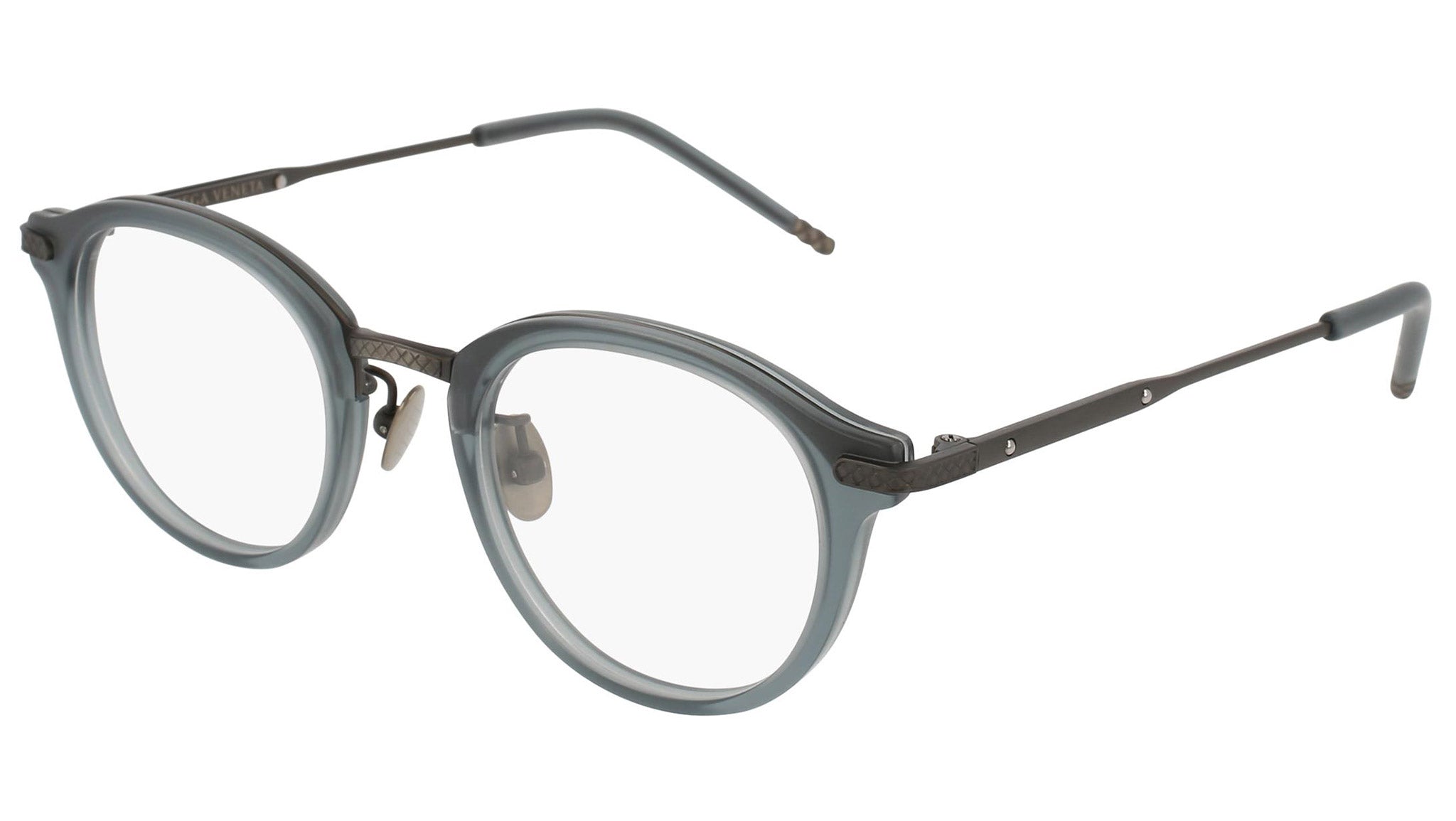 Occhiali da vista Bottega Veneta modello 0126O 003 featuring matte transparent green and semimatte antique silver front frame and silver temple.