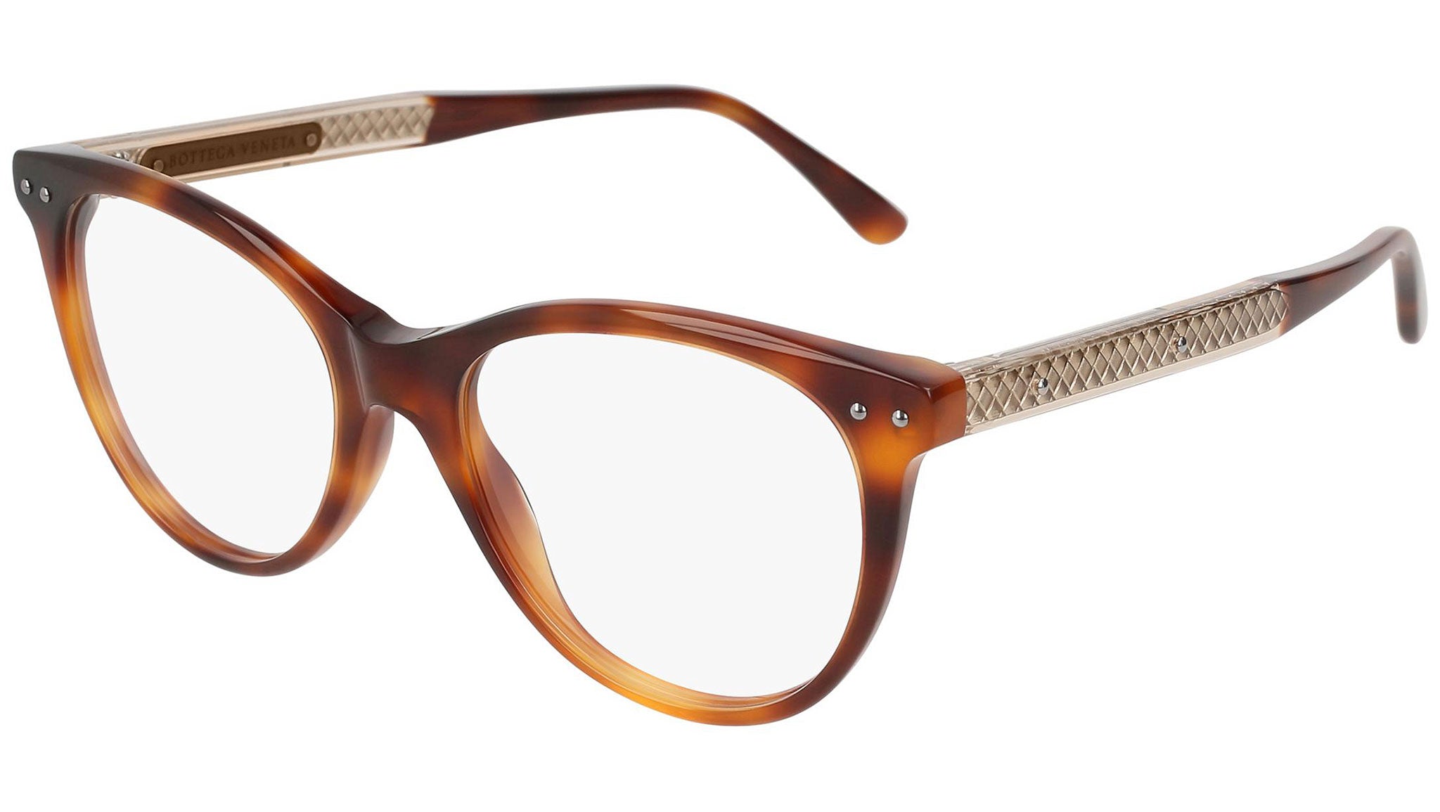 Occhiali da vista Bottega Veneta modello BV0129O 002 featuring shiny medium havana frame and yellow temple.