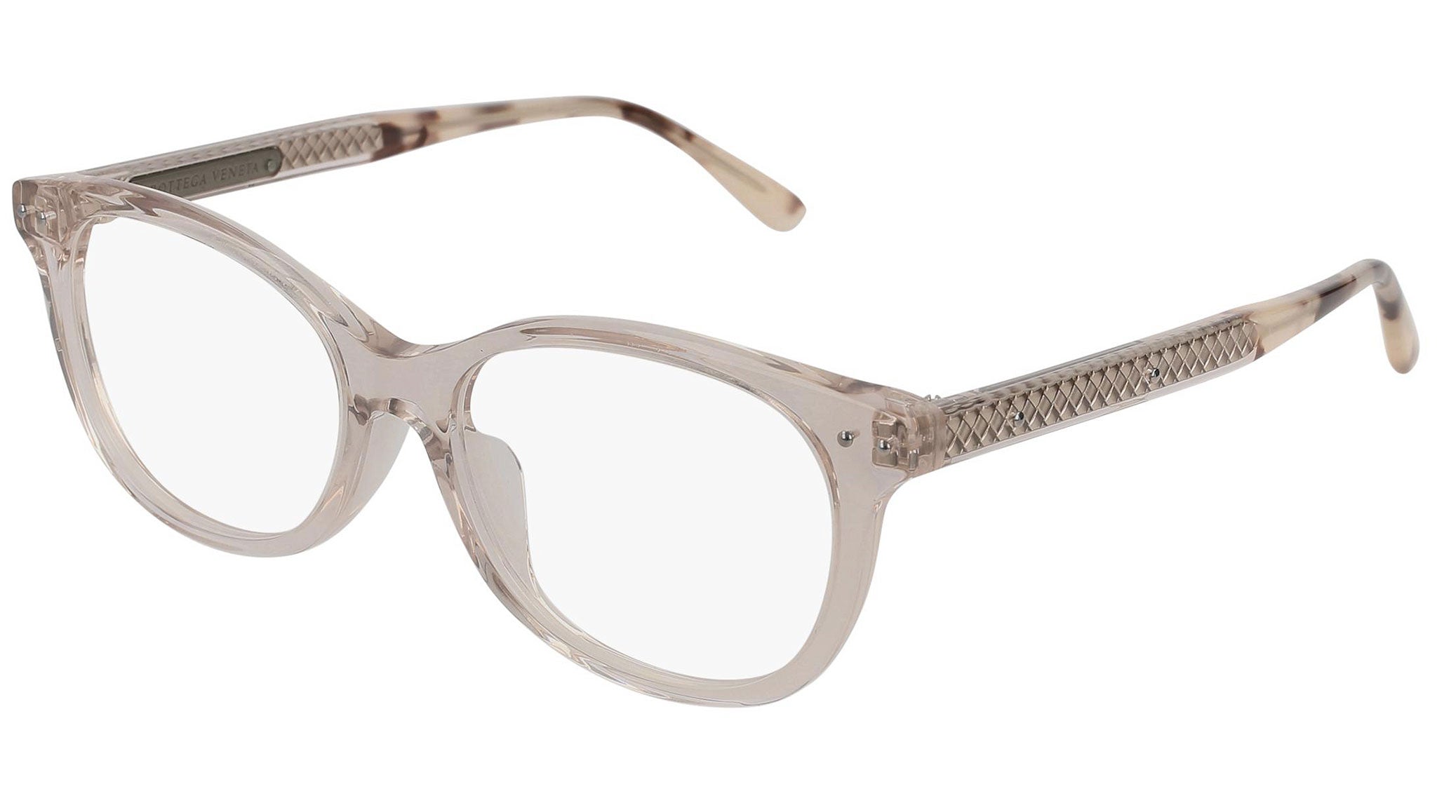 Occhiali da vista Bottega Veneta modello BV0129OA 004 featuring shiny transparent powder frame and nude temple.