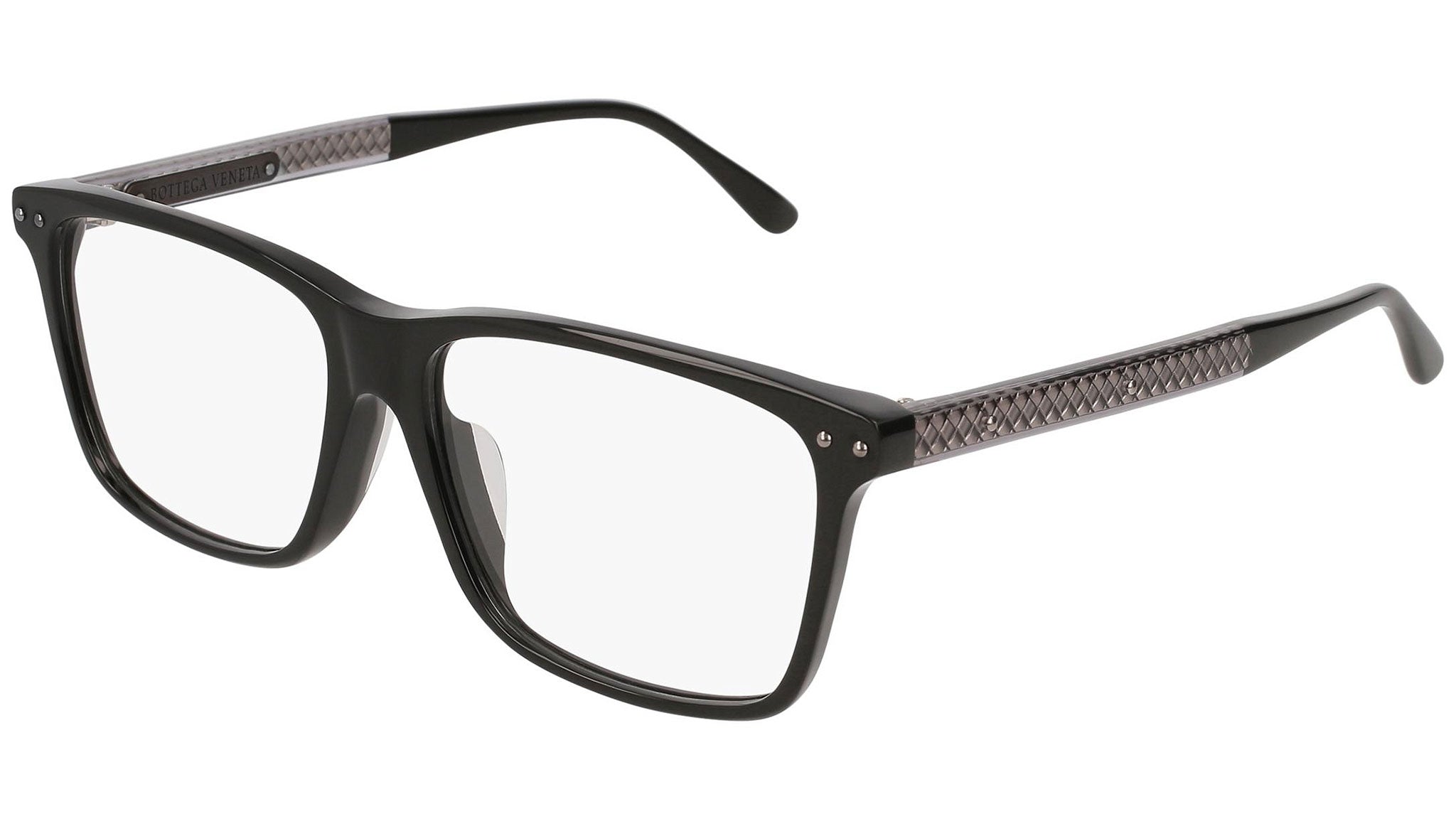 Occhiali da vista Bottega Veneta modello BV0130OA 001 featuring shiny black frame and grey temple.