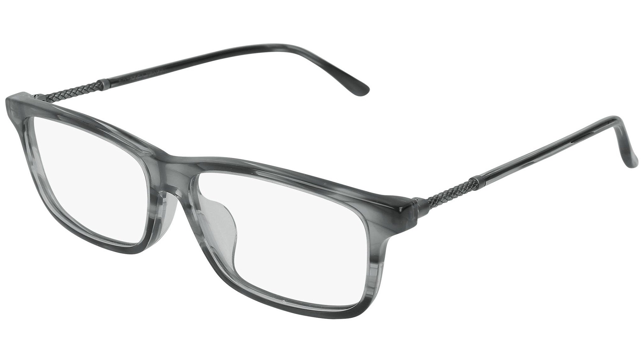 Occhiali da vista Bottega Veneta modello BV0135OA 003 featuring shiny melange grey havana frame and silver temple.